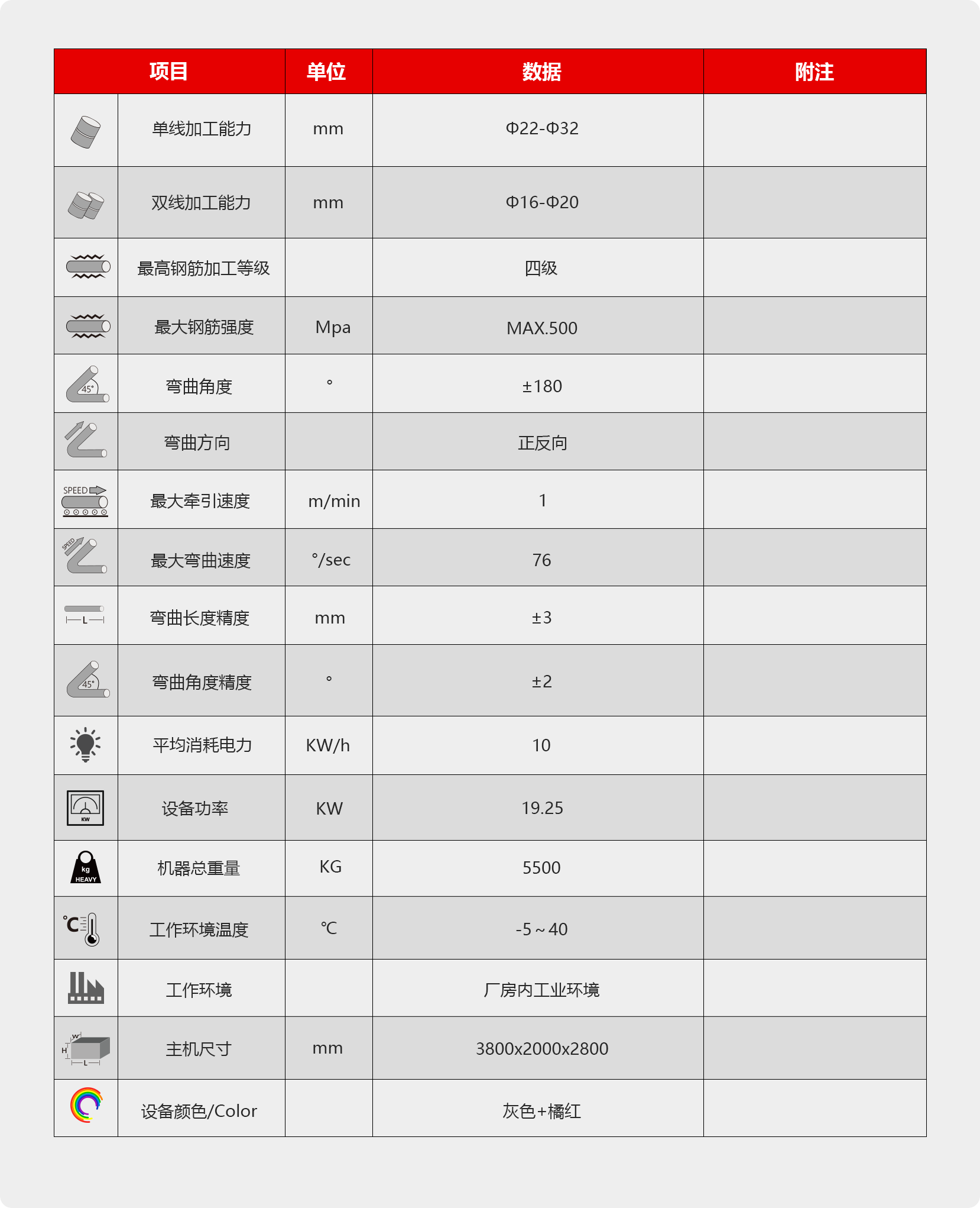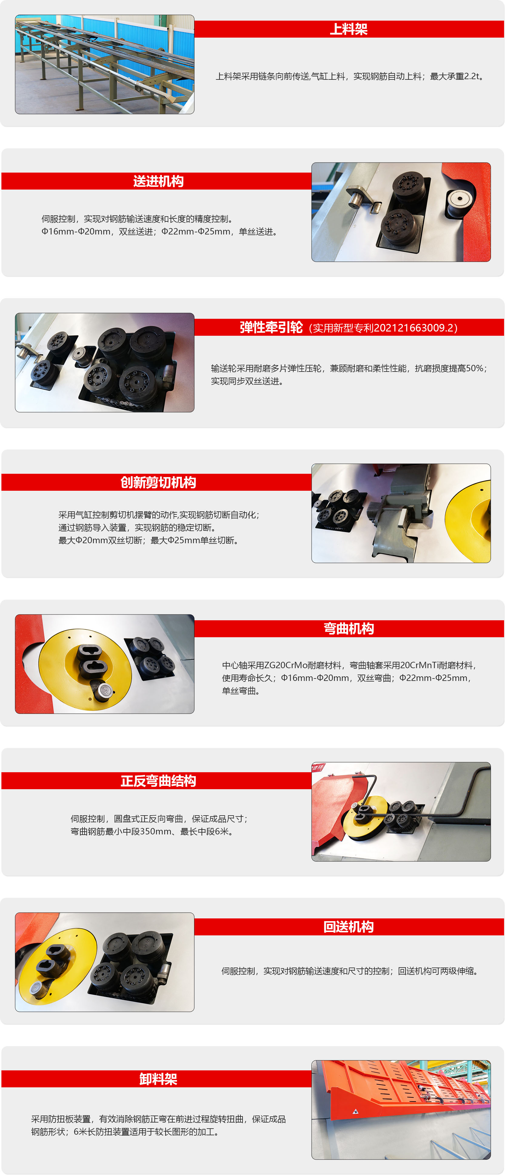 用于最长12米,Φ16-Φ25的直条钢筋的加工成型,生产出设定角度和长度的钢筋图形。 专利情况:实用新型专利202120163821.2 产品型号描述:BQ25W-1集具有上料、送进、切断、弯曲、回送、防扭卸料、接料功能于一体, 采用伺服控制钢筋加工长度和角度的精准定位; 实现最大牵引速度60m/min、最大弯曲速度76°/s的全自动稳定生产 加工钢筋范围Ф16mm-Ф20mm,双丝加工;Ф22mm-Ф25mm,单丝加工。 设备平均产能:单丝直径25,中段1000mm,U型钢筋为例:约300根/小时;双丝直径16mm,中段350,U型钢筋为例:约800根/小时。