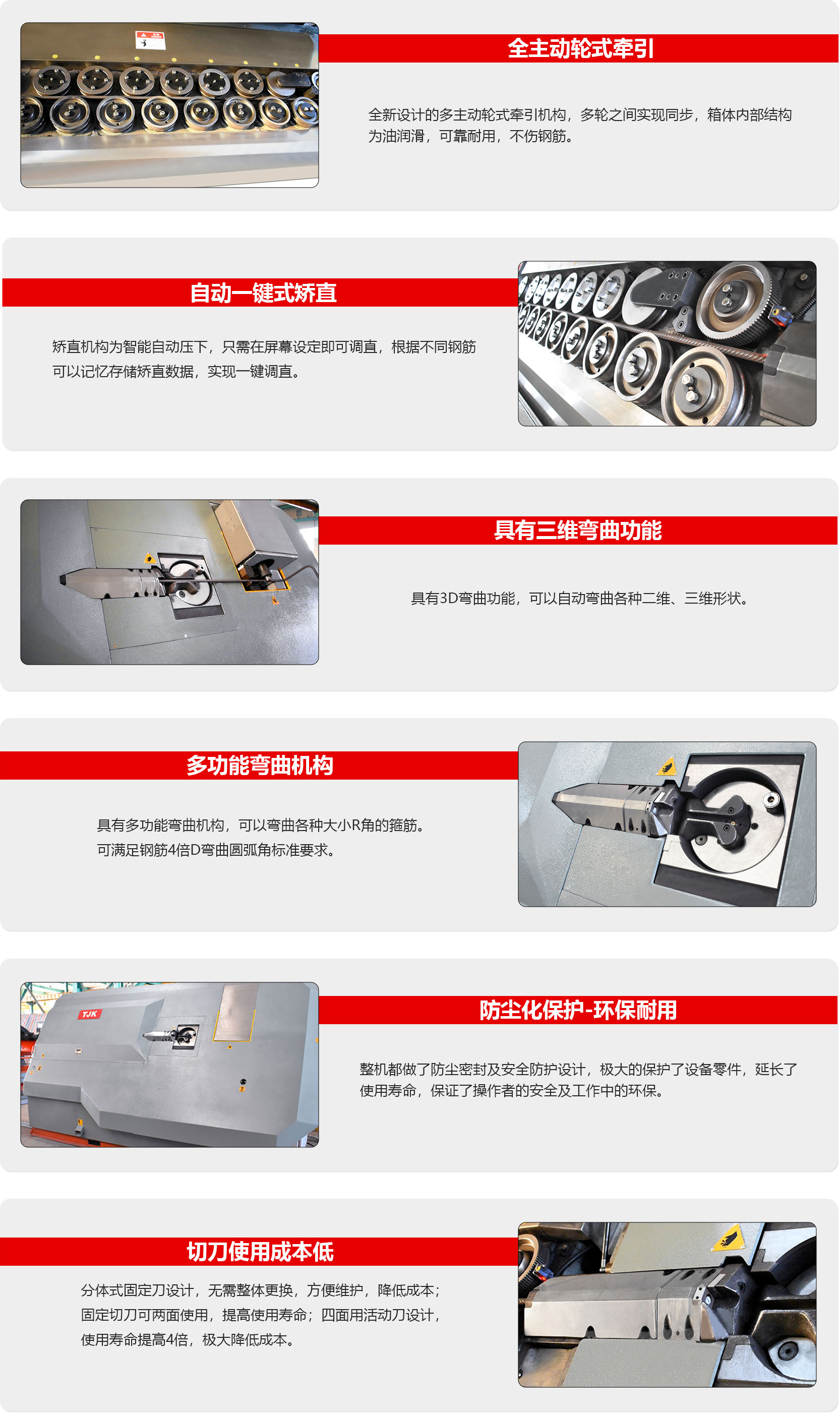 WG13JP数控钢筋弯箍机,具有全新设计的多主动轮式牵引机构,多轮之间实现同步动力,不伤钢筋,矫直机构为自动压下数控矫直,具有一键矫直功能。也可以在国内、国 际其他市场推广应用。