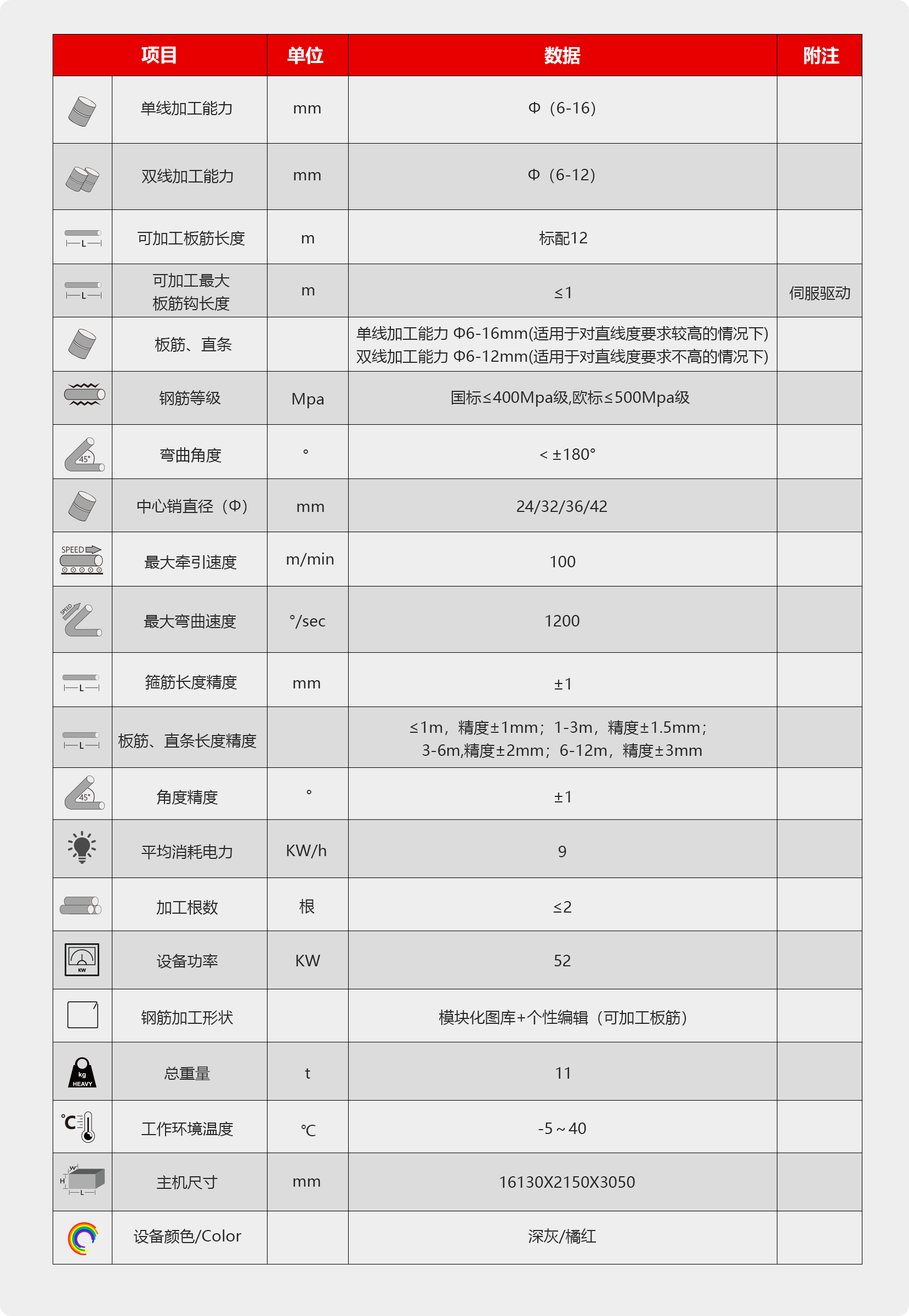 WG16F-2多功能智能钢筋弯箍机器人为大型多功能机型,可最大加工到16mm的盘条钢筋。既可以加工箍筋,又可以自动加工各种长板筋,伺服驱动的回送弯曲可以自动设置弯曲各种长度和角度的板筋钩,大型伸缩式接料机构设计,加工范围大,具有防扭转矫正机构,保证了成品的精度和平整度。一机多能,大量应用于钢筋加工配送工厂。