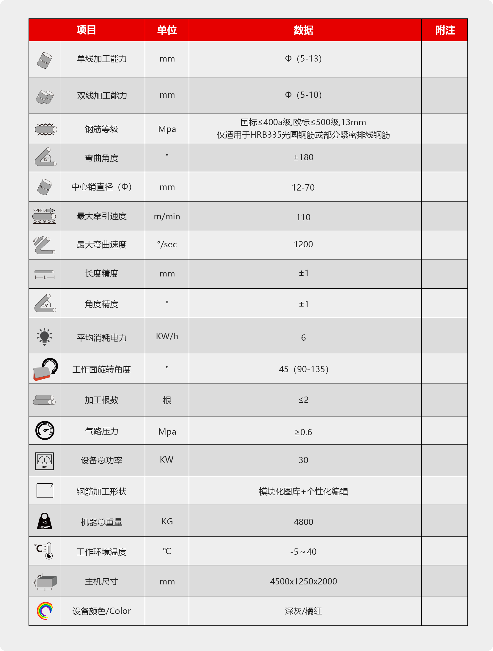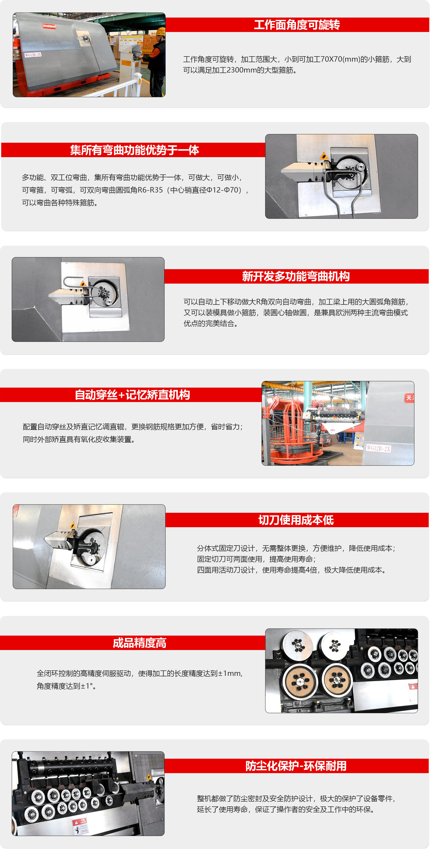 WG12B-2X智能钢筋弯箍机器人是我公司独有的工作面角度可以自动旋转的机型, 新开发的多功能、双工位弯曲,集所有弯曲功能优势于一体,是兼具欧洲两种主流弯曲 模式优点的完美结合。配置了自动穿丝机构,矫直记忆机构,具有操作方便、可加工范 围大的特点。适用于高效的加工各种箍筋,广泛的应用于国内外高端市场。