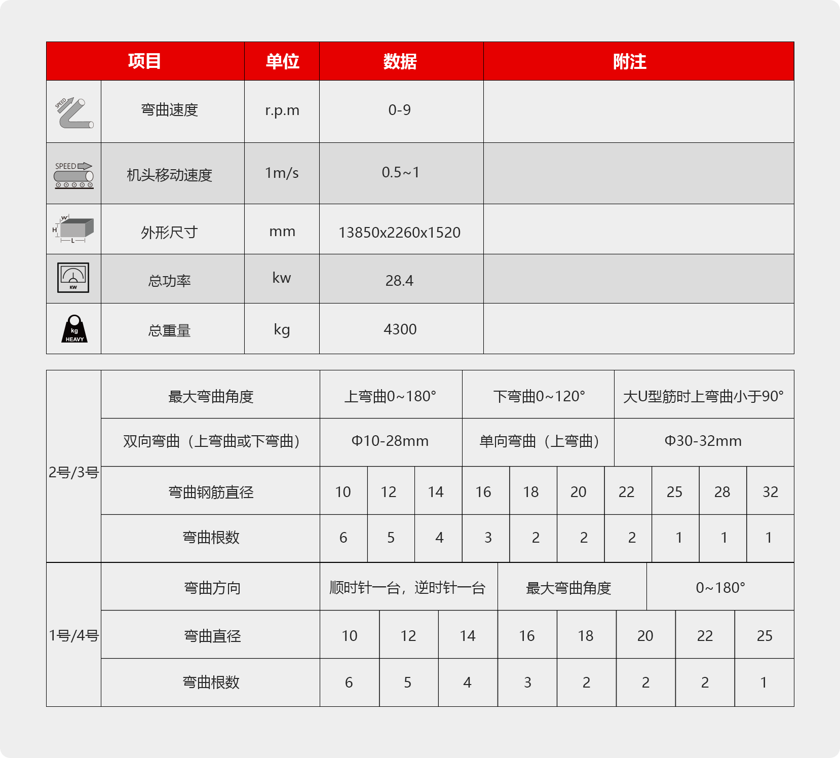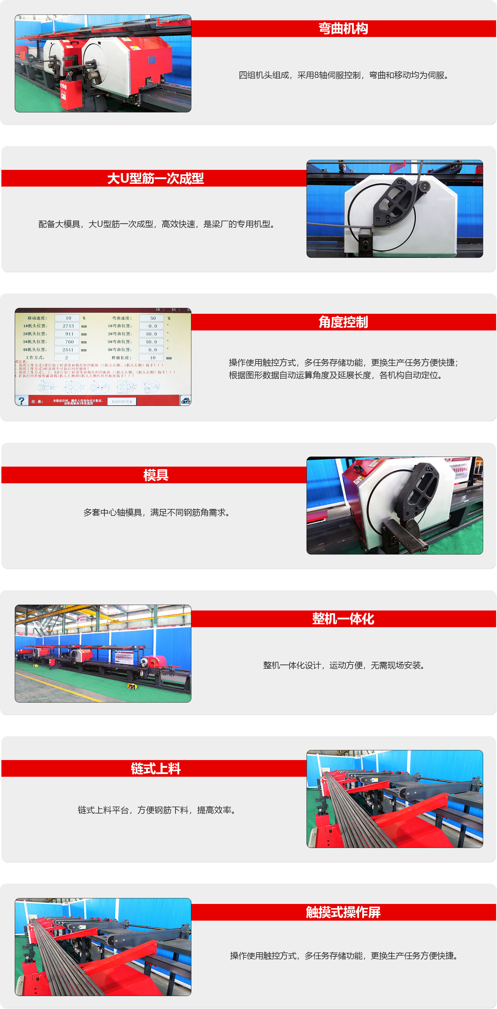 此设备采用8轴伺服控制,4台弯曲机构和行走机构,均采用绝对值伺服控制,是一台多功能型设备;既能具备立式弯所有功能,又能弯曲梁厂大R半径一次成型;并且可以作为2台双拉钩使用,效率高。