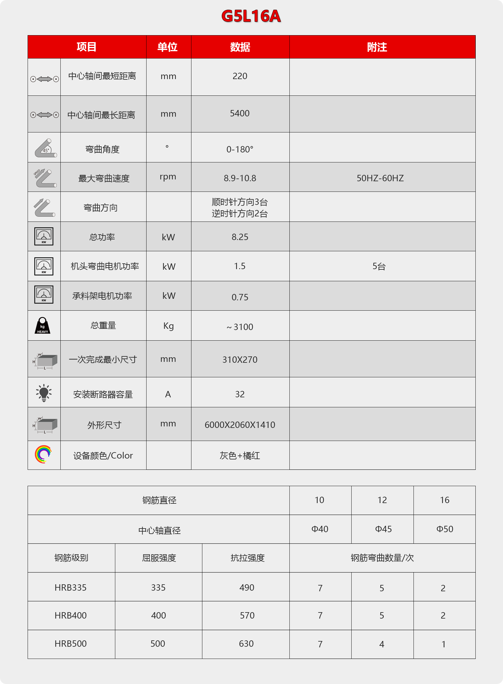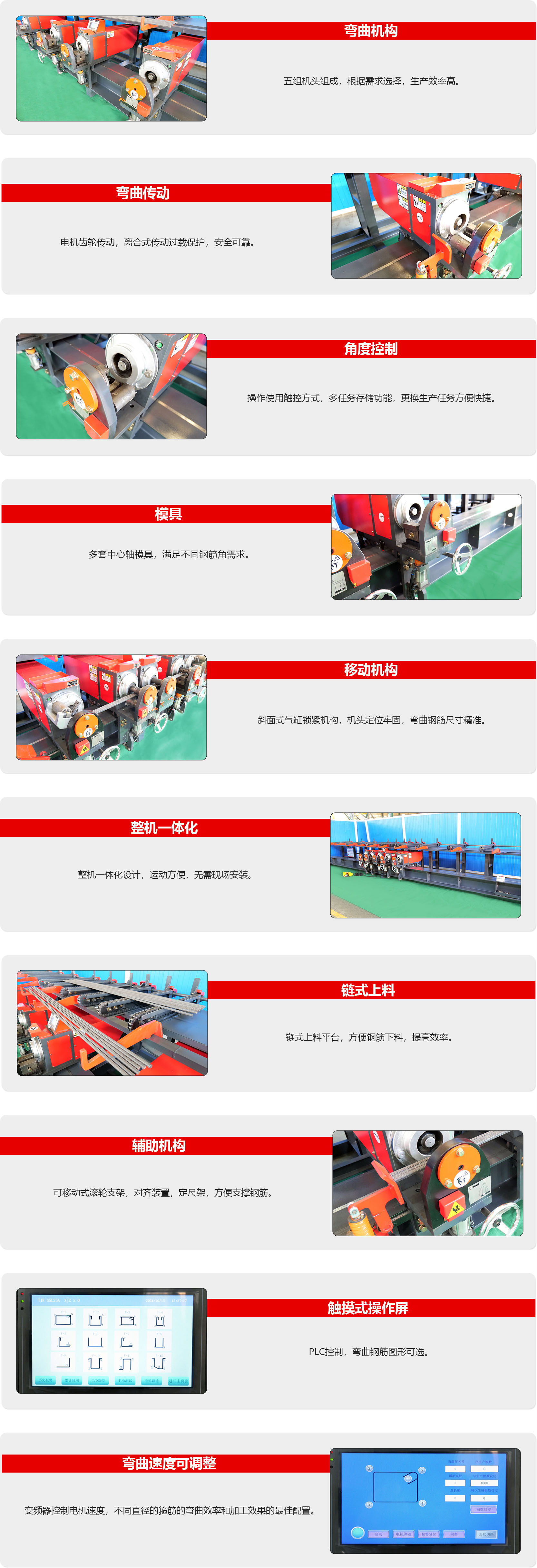 该设备采用整机一体式结构设计;主要由链式储料架和五组弯曲机头组成;根据需求选择多机头或单机头工作,极大的提高了生产效率,且降低了工人劳动强度;配置5套模具,满足不同直径钢筋弯曲R角需求;手摇式弯曲机头移动长度定尺,气缸锁紧定位;紧凑型高强度箱体设计;弯曲机构采用离合缓冲装置,遇到较大阻力时离合脱开,保护机械结构。