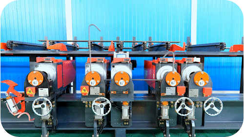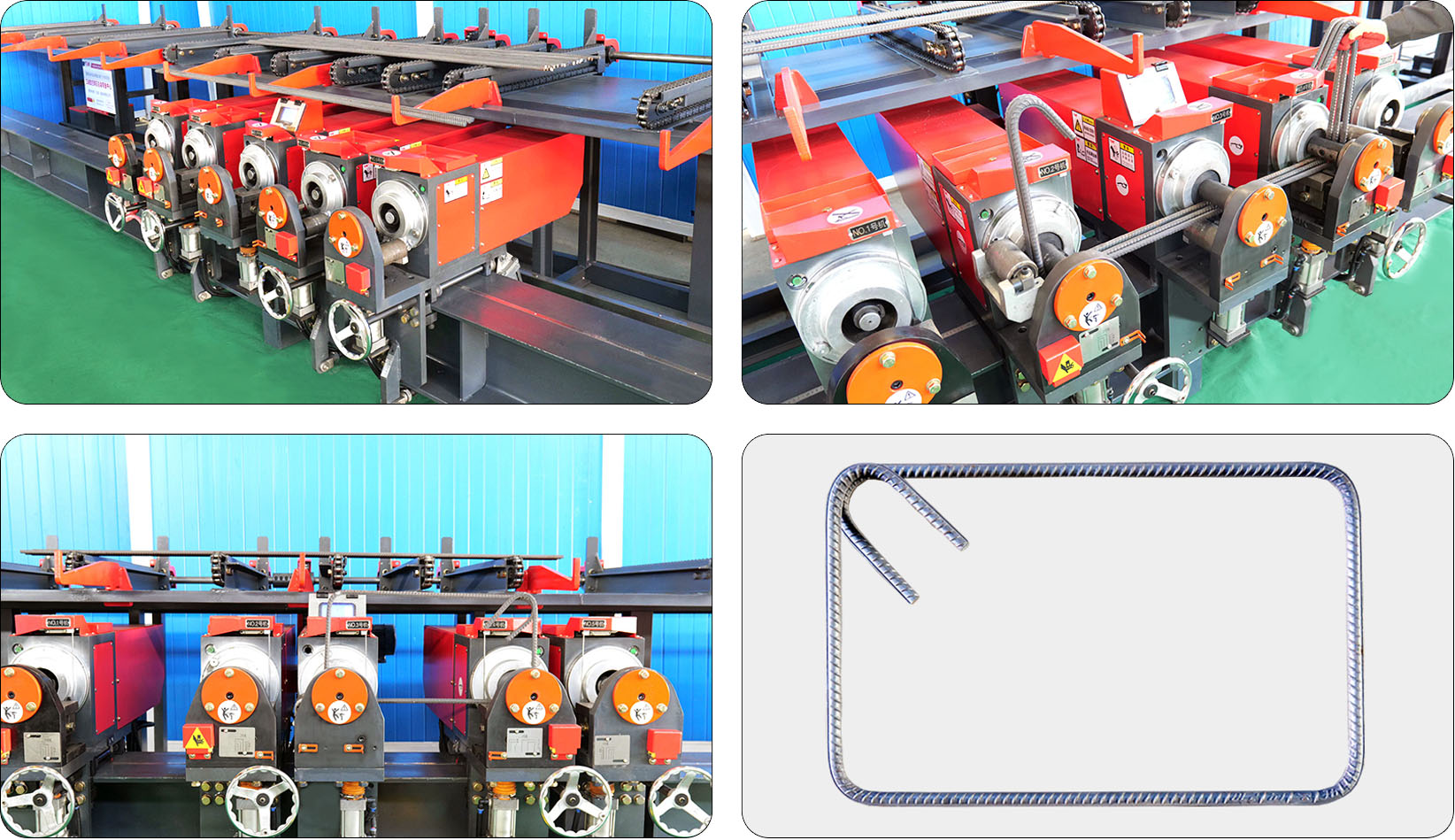 该设备采用整机一体式结构设计;主要由链式储料架和五组弯曲机头组成;根据需求选择多机头或单机头工作,极大的提高了生产效率,且降低了工人劳动强度;配置5套模具,满足不同直径钢筋弯曲R角需求;手摇式弯曲机头移动长度定尺,气缸锁紧定位;紧凑型高强度箱体设计;弯曲机构采用离合缓冲装置,遇到较大阻力时离合脱开,保护机械结构。