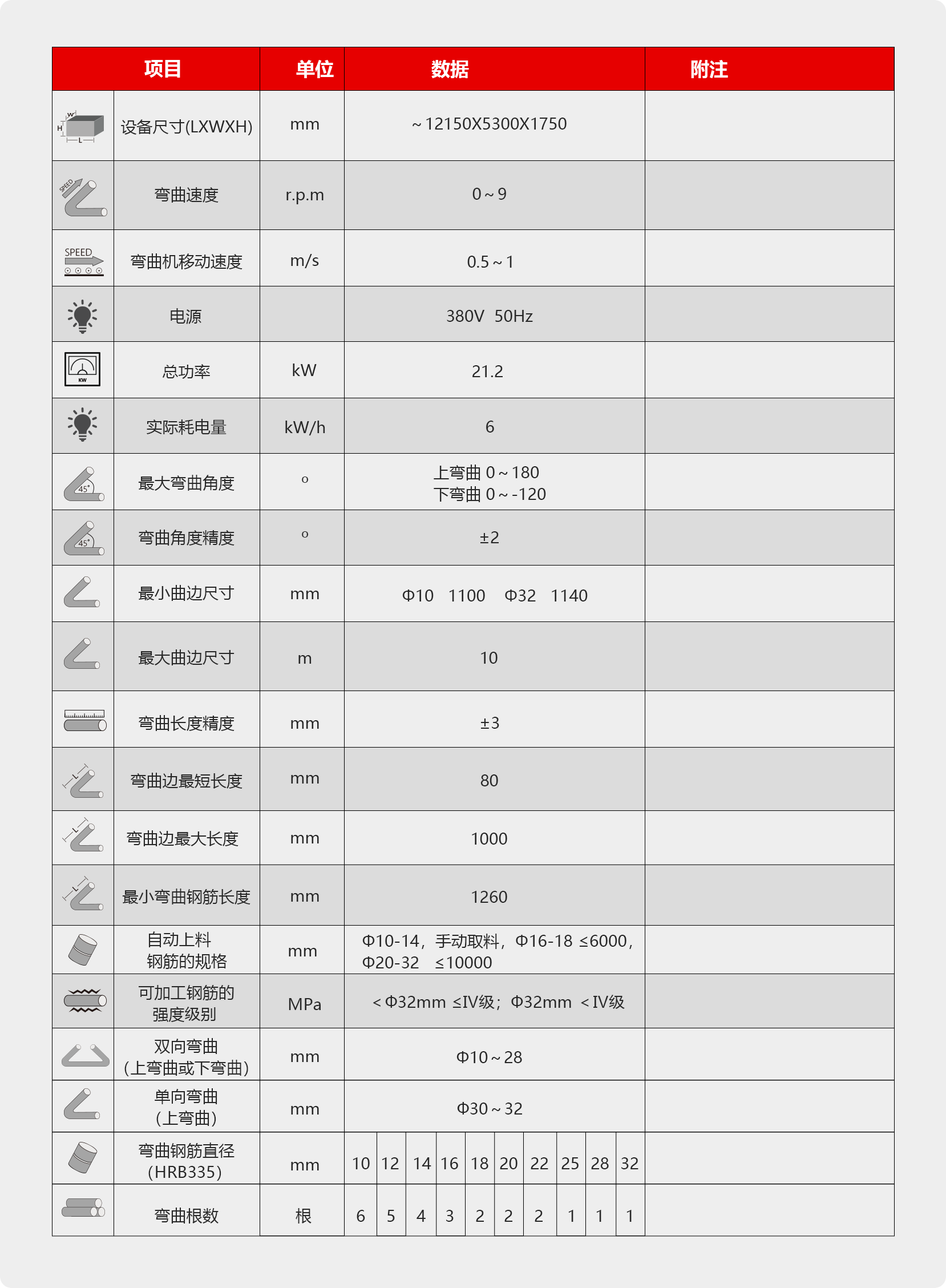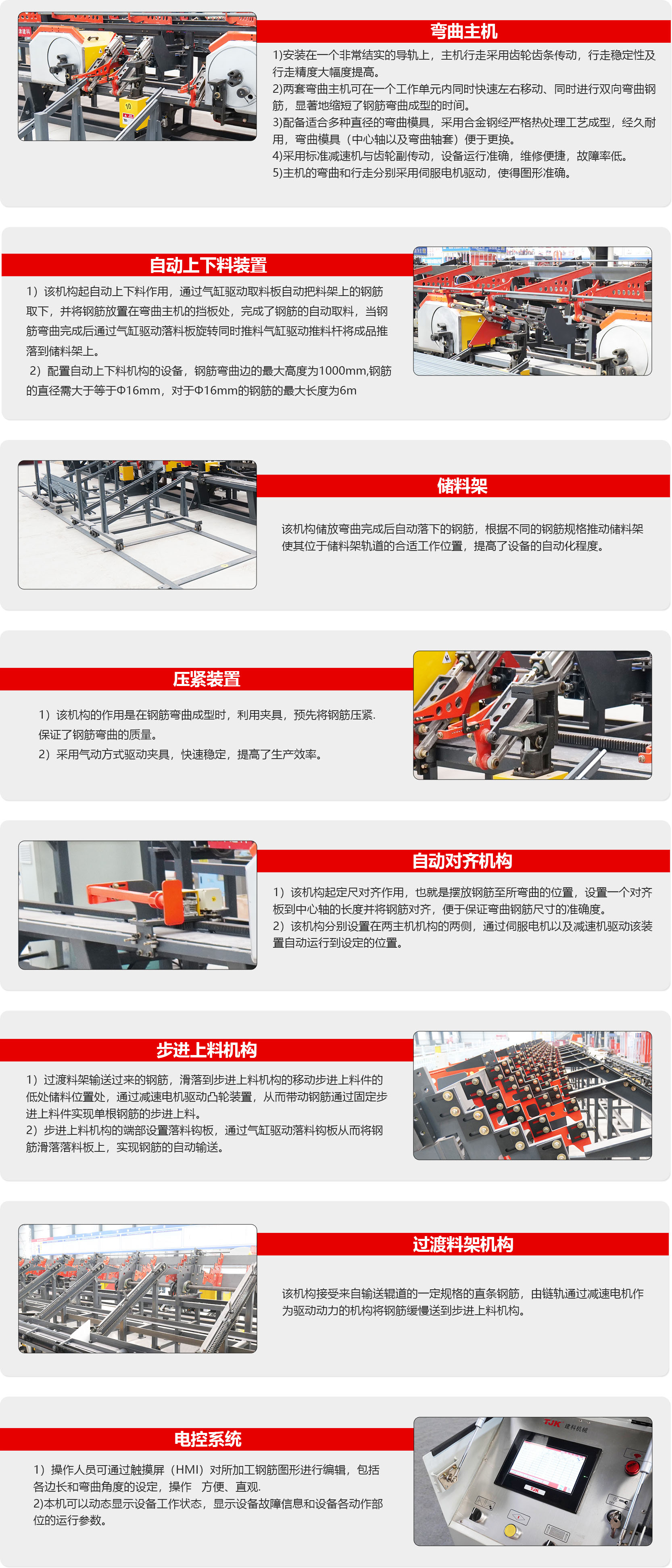本产品将定尺切断后的钢筋弯曲成正方形、矩形、板筋、U形筋等不同形状的设备??墒迪炙蛲蓖淝纸?,自动化程度高,操作简便易行。该设备的特点是速度快,实用,可靠,非常受国内、外客户的信赖与青睐,具有强大的信息化拓展能力,图形储存能力,内置常用钢筋图形,触控操作面板调整、设置十分便捷。