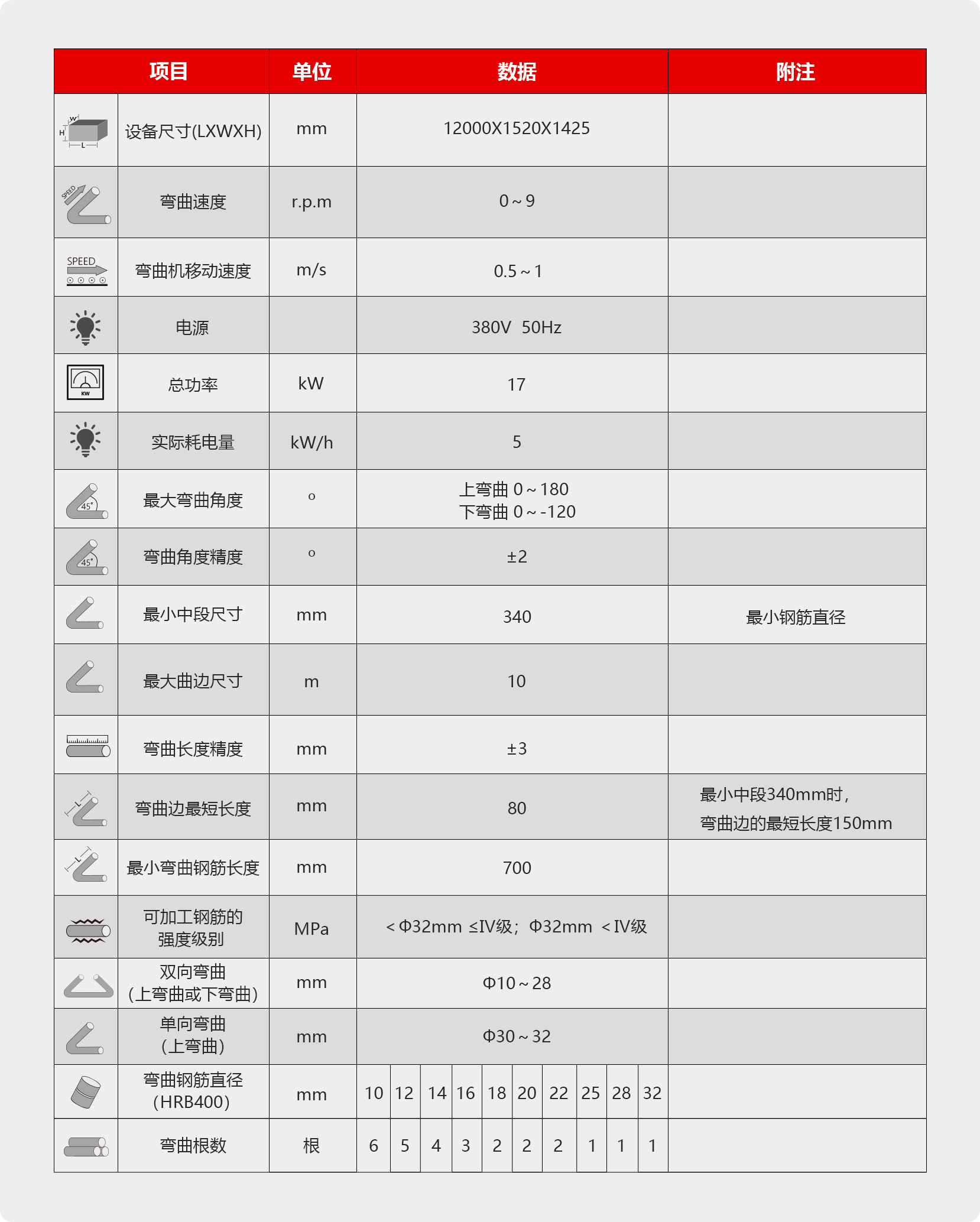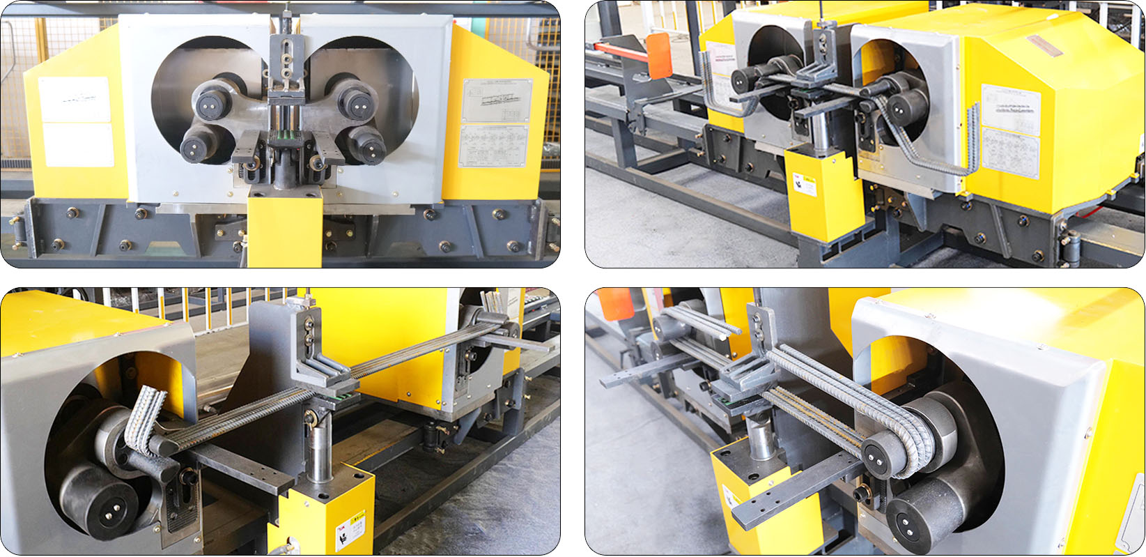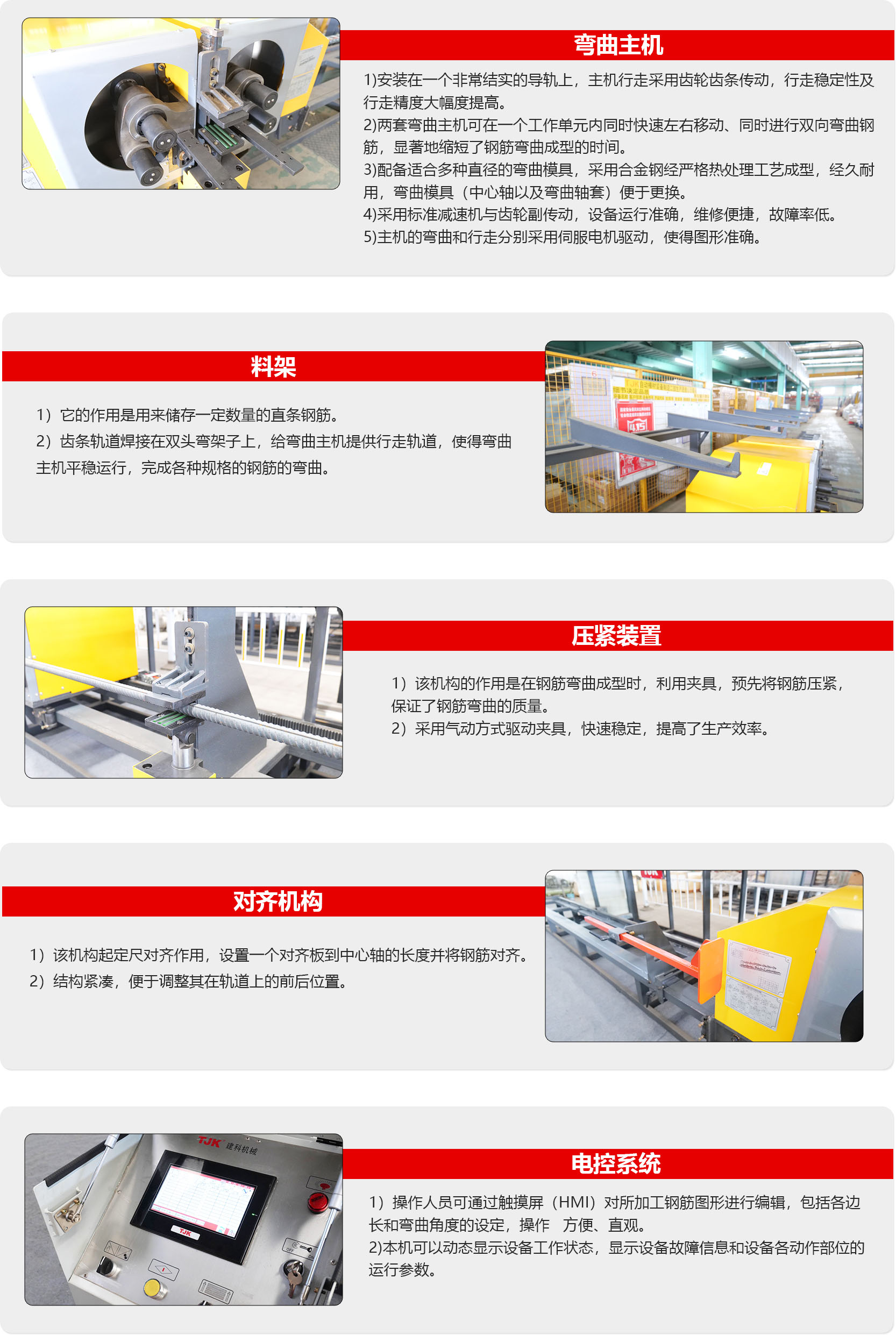 本产品将定尺切断后的钢筋弯曲成正方形、矩形、板筋、U形筋、马蹄筋等不同形状的设备。可实现双向同时弯曲钢筋,自动化程度高,操作简便易行。该设备的特点是速度快,实用,可靠,非常受国内、外客户的信赖与青睐,具有强大的信息化拓展能力,图形储存能力,内置常用钢筋图形,触控操作面板调整、设置十分便捷。