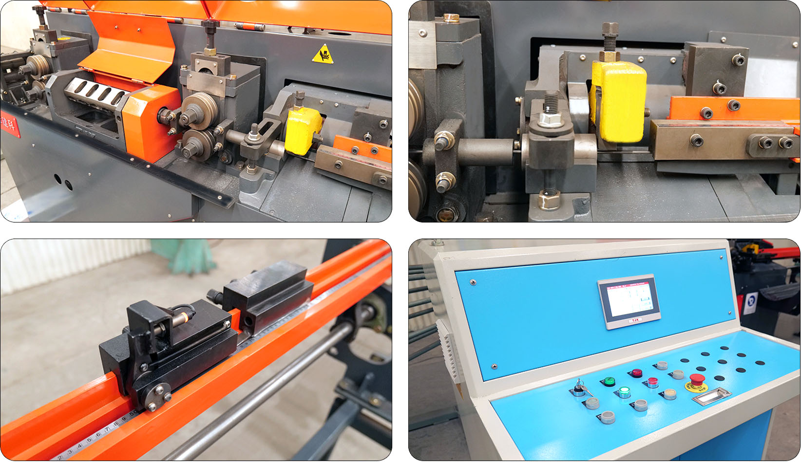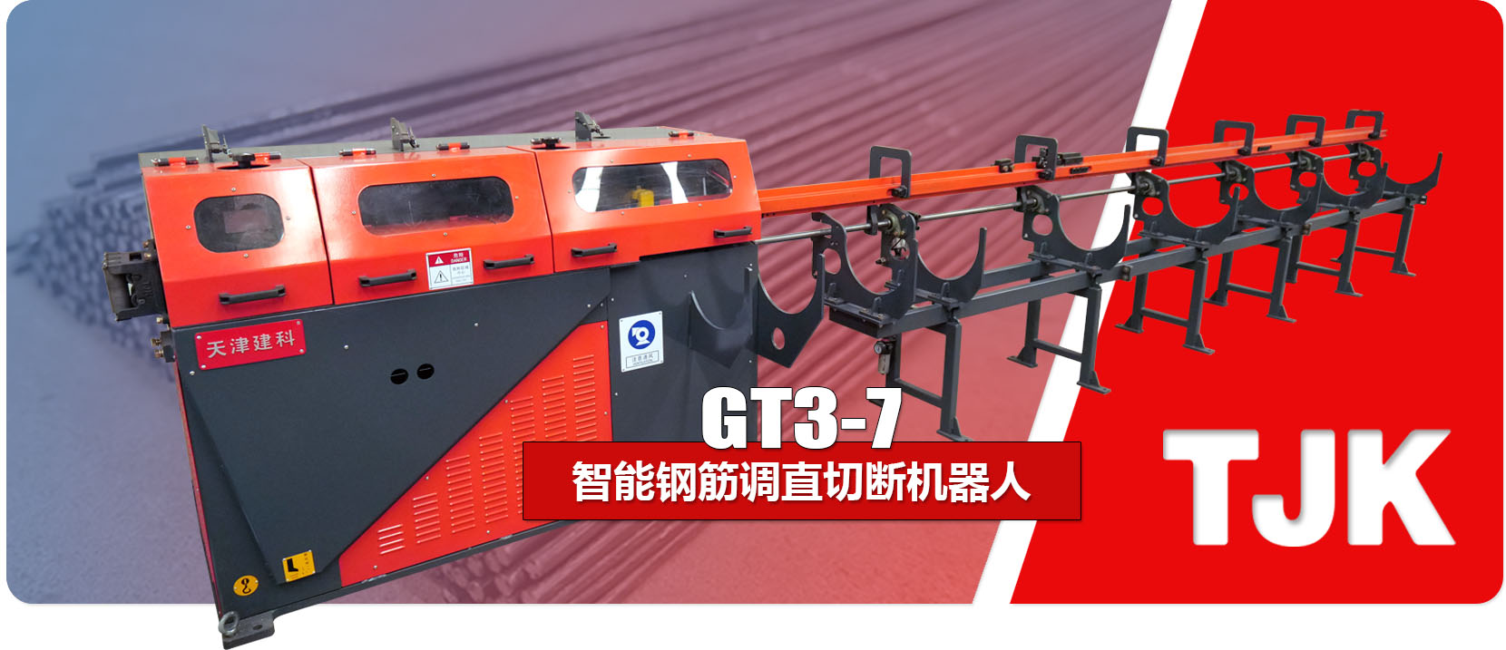 把盘螺或盘圆,通过各种形式的调直机构把钢筋调直,能保持规则的直线段,调直 机构要方便调整钢筋的直度,计长机构方便长度测量,与钢筋接触的牵引轮、调直轮要 耐磨,容易更换,料架要利于打包吊装,常见的调直机构有旋转调直和轮式调直两种方 式,也可以将这两种方式进行结合,GT3-7智能钢筋调直切断机器人是旋转调直机,伺 服剪切,表面损伤小,能自动统计加工根数,打包不停机,生产效率高。