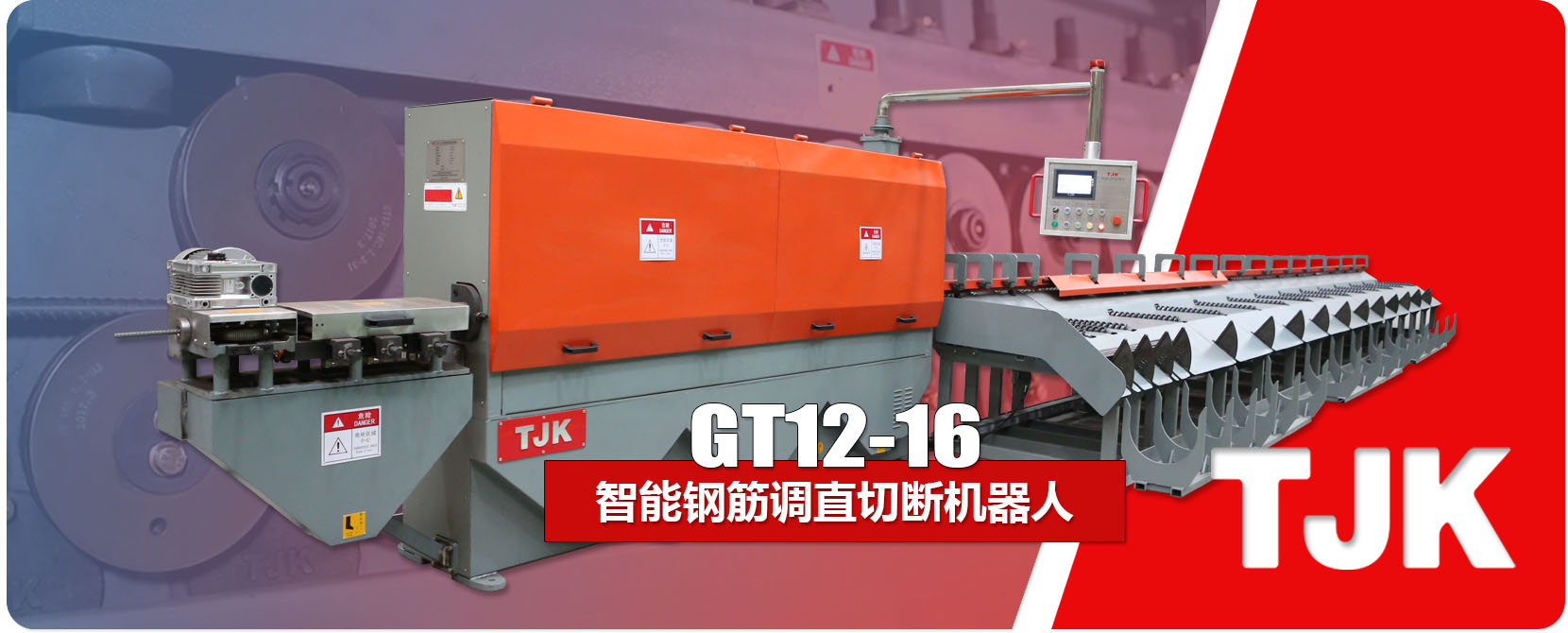 把盘螺或盘圆,通过各种形式的调直机构把钢筋调直,能保持规则的直线段,调直 机构要方便调整钢筋的直度,计长机构方便长度测量,与钢筋接触的牵引轮、调直轮要 耐磨,容易更换,料架要利于打包吊装,常见的调直机构有旋转调直和轮式调直两种方 式,也可以将这两种方式进行结合,GT12-16智能钢筋调直切断机器人是具有水平和纵 向调直机构的轮式调直机,可两个方向调直、自动计长剪切,表面损伤小,能自动统计 加工根数,缓冲接料使吊装打包不停机。能多任务快速调直剪切钢筋,生产效率高。