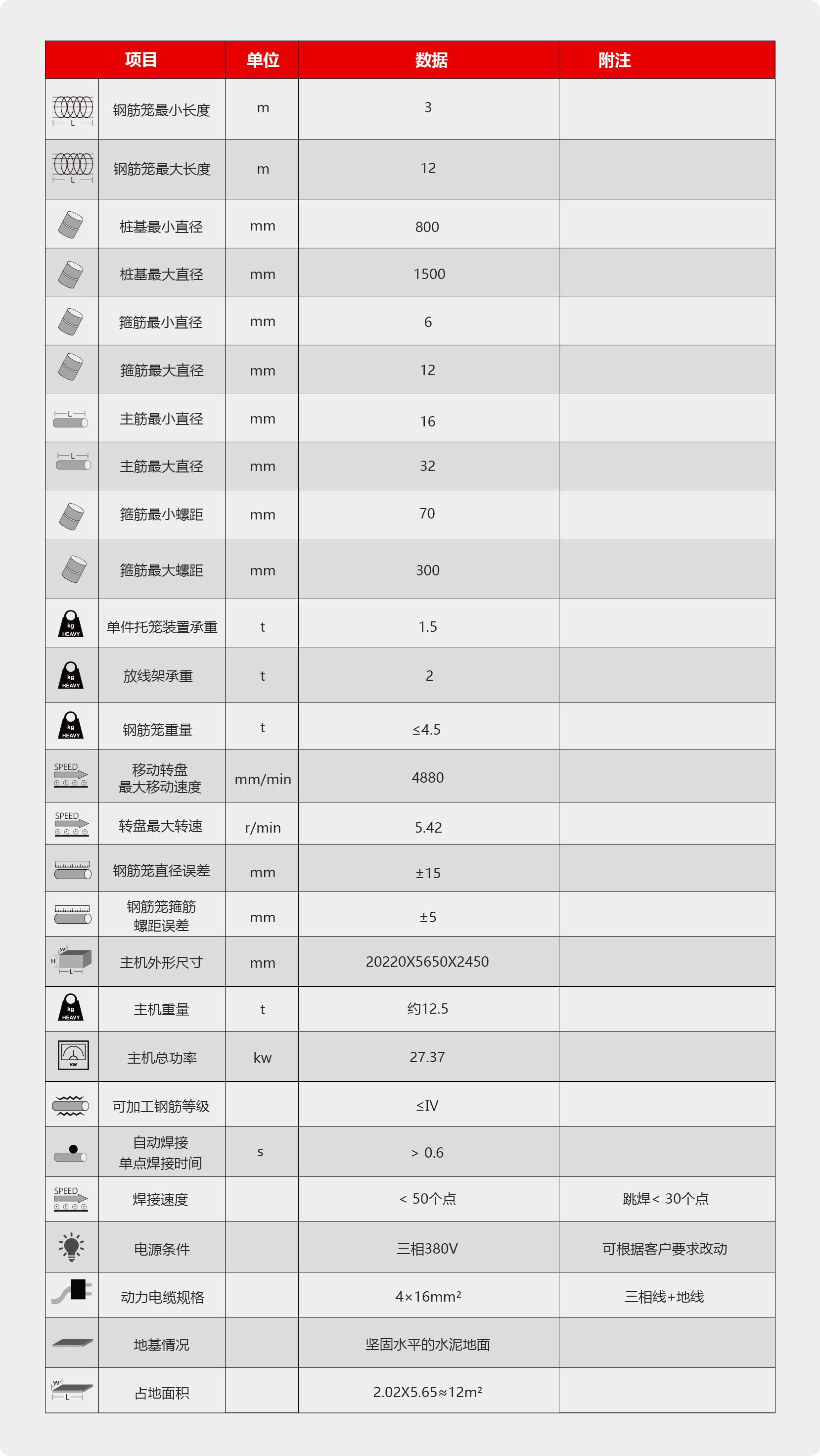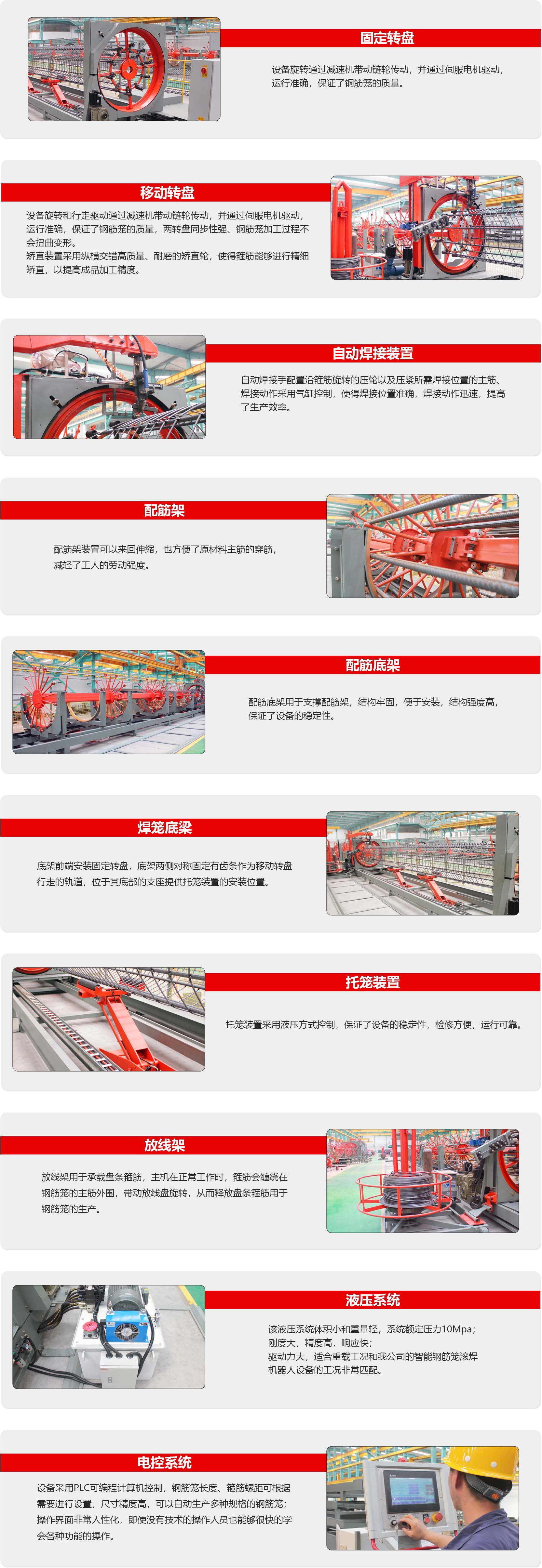 该设备可根据客户的需要配备相应的模圈或者圆盘,将盘条或者直条箍筋螺旋缠绕并焊接在主筋外侧,实现不同规格的钢筋笼的自动化生产,产量大、精度高、变换规格方便、操作故障率低、节能性强、消耗低、质量高。