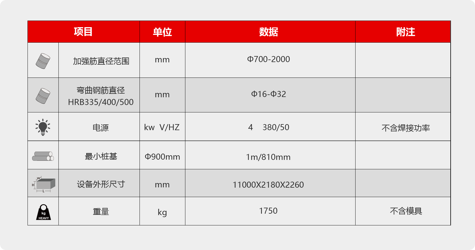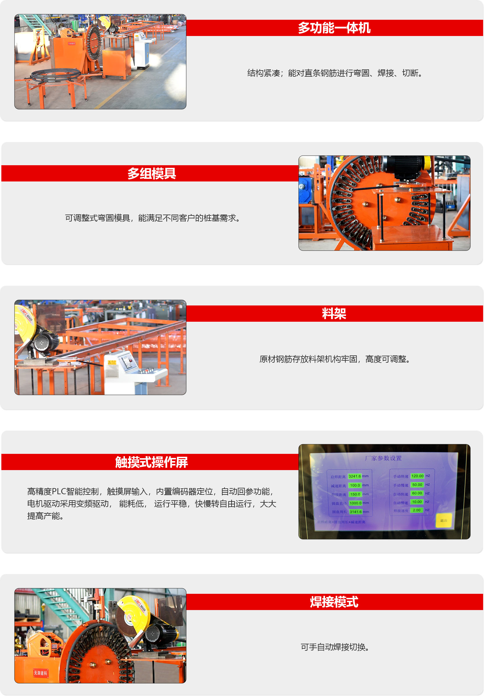 该设备是加工钢筋笼内加强圈的多功能一体机,结构紧凑; 能对直条钢筋进行弯圆、焊接、切断。可调整式弯圆模具,能满足不同客户的桩基需求; 原材钢筋存放料架机构牢固,高度可调整。
