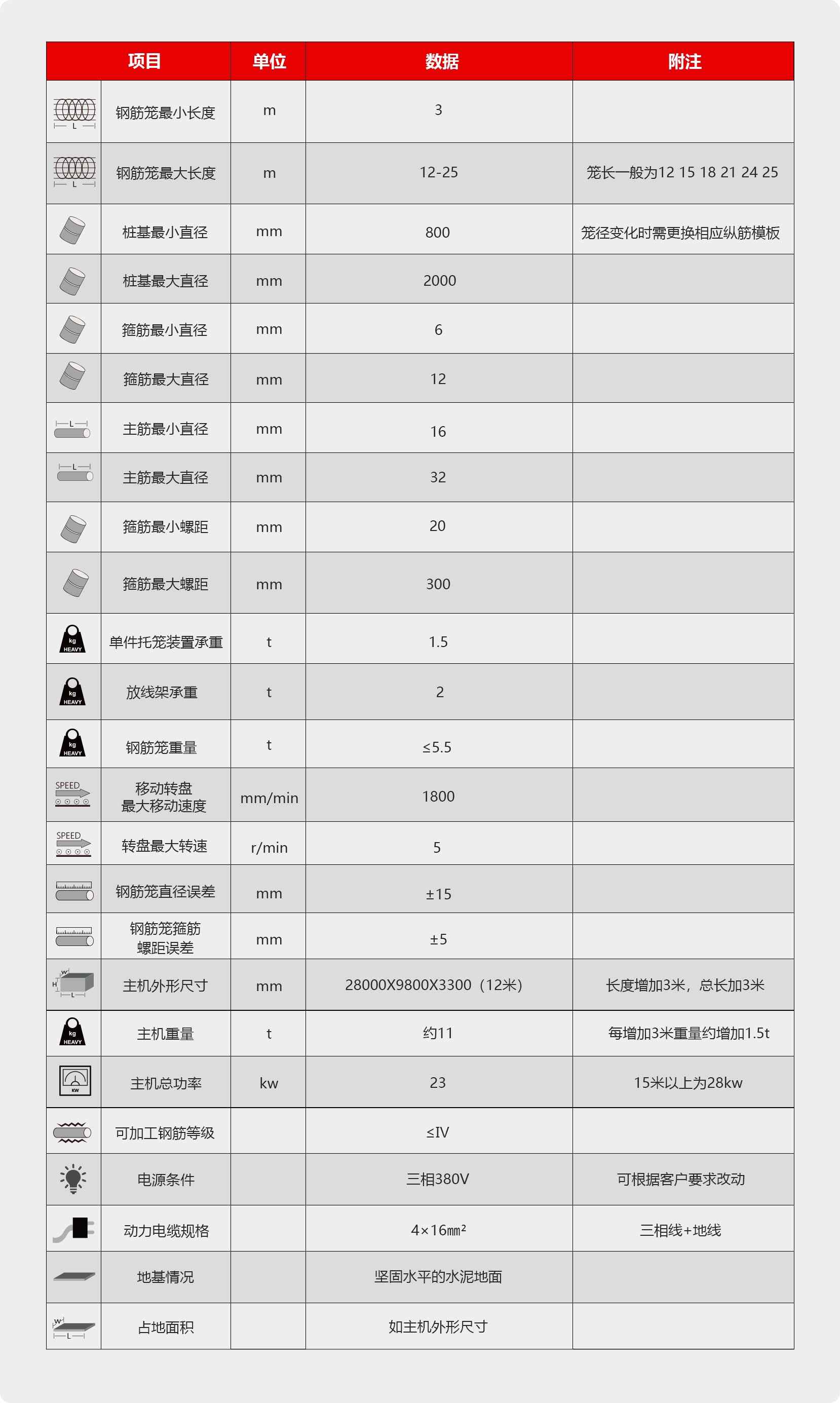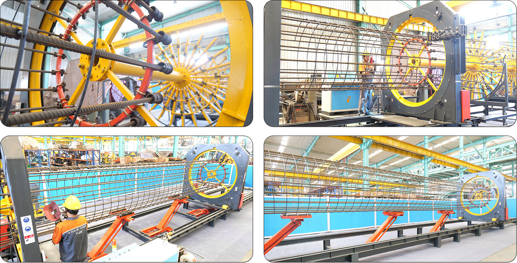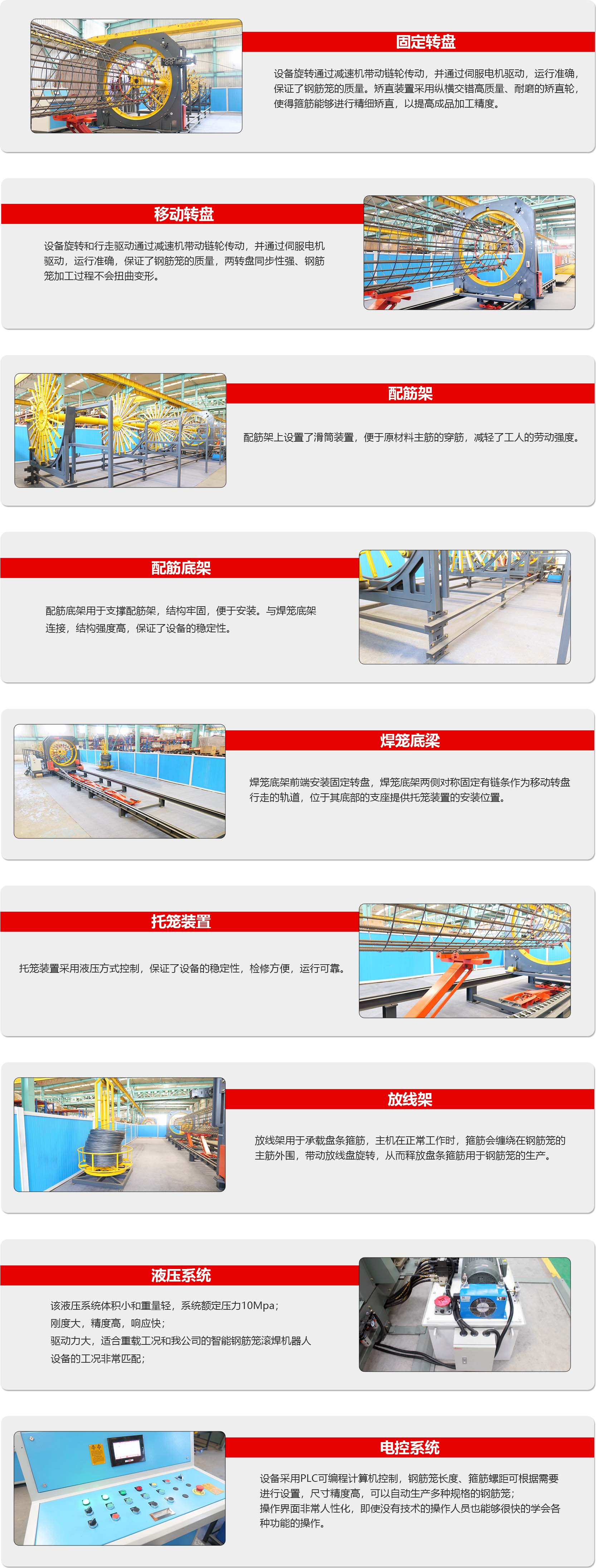 该设备可根据客户的需要配备相应的模圈或者圆盘,将盘条或者直条箍筋螺旋缠绕并焊接在主筋外侧,实现不同规格的钢筋笼的自动化生产,产量大、精度高、变换规格方便、操作故障率低、节能性强、消耗低、质量高。