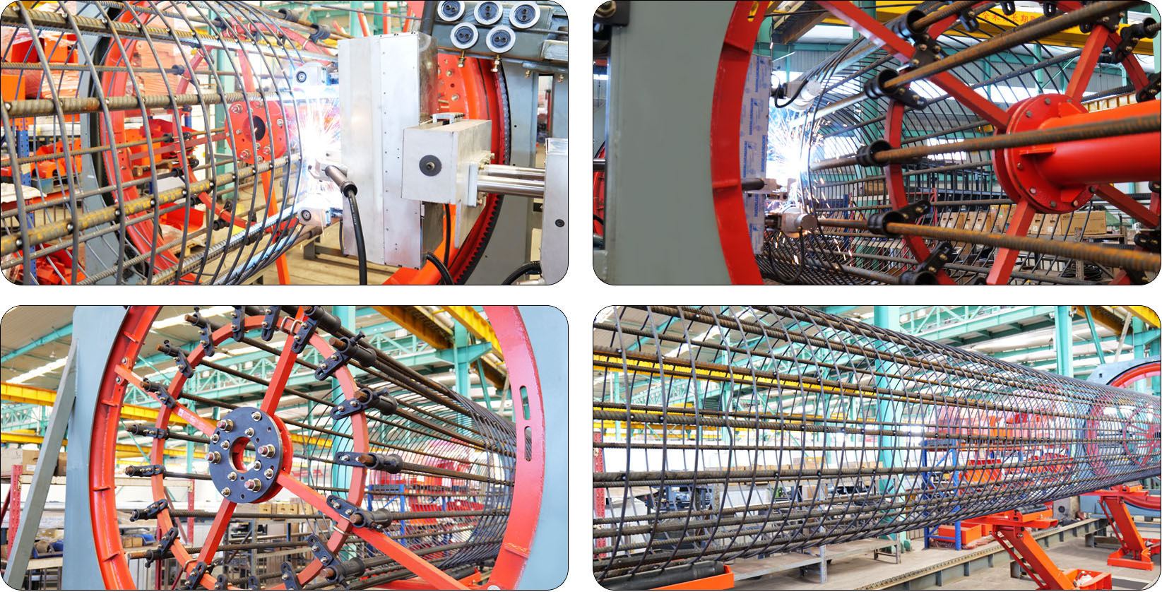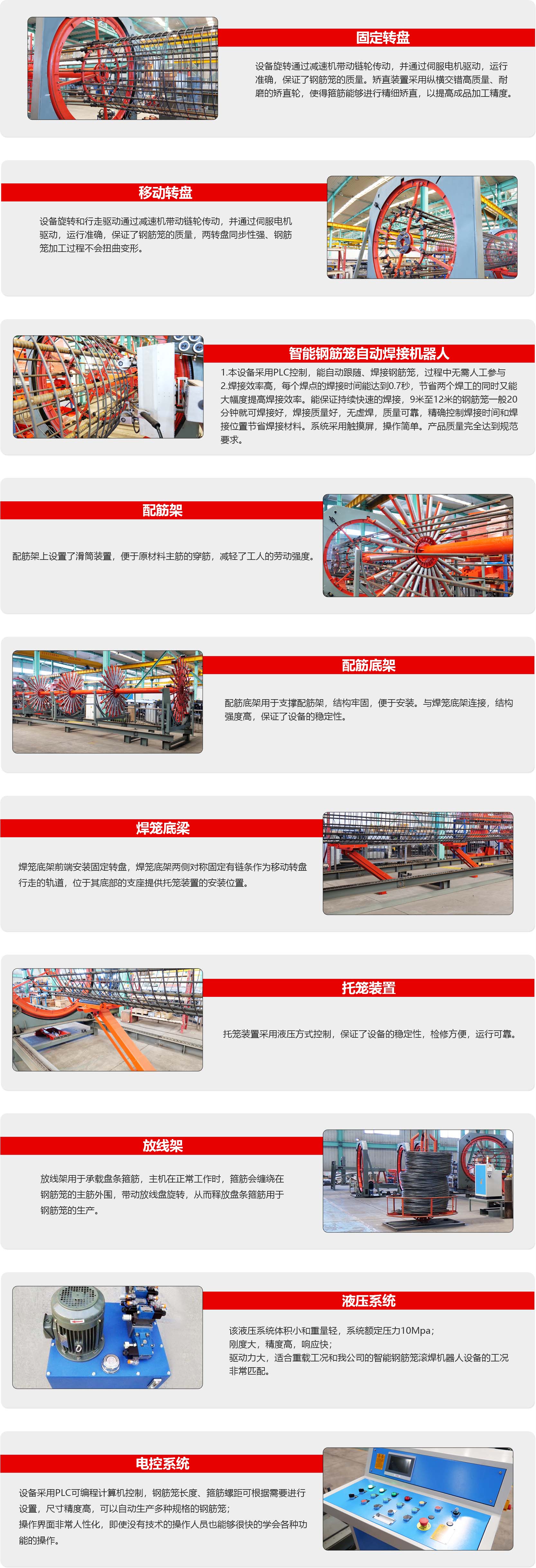 该设备可根据客户的需要配备相应的模圈或者圆盘,将盘条或者直条箍筋螺旋缠绕并焊接在主筋外侧,实现不同规格的钢筋笼的自动化生产,产量大、精度高、变换规格方便、操作故障率低、节能性强、消耗低、质量高。