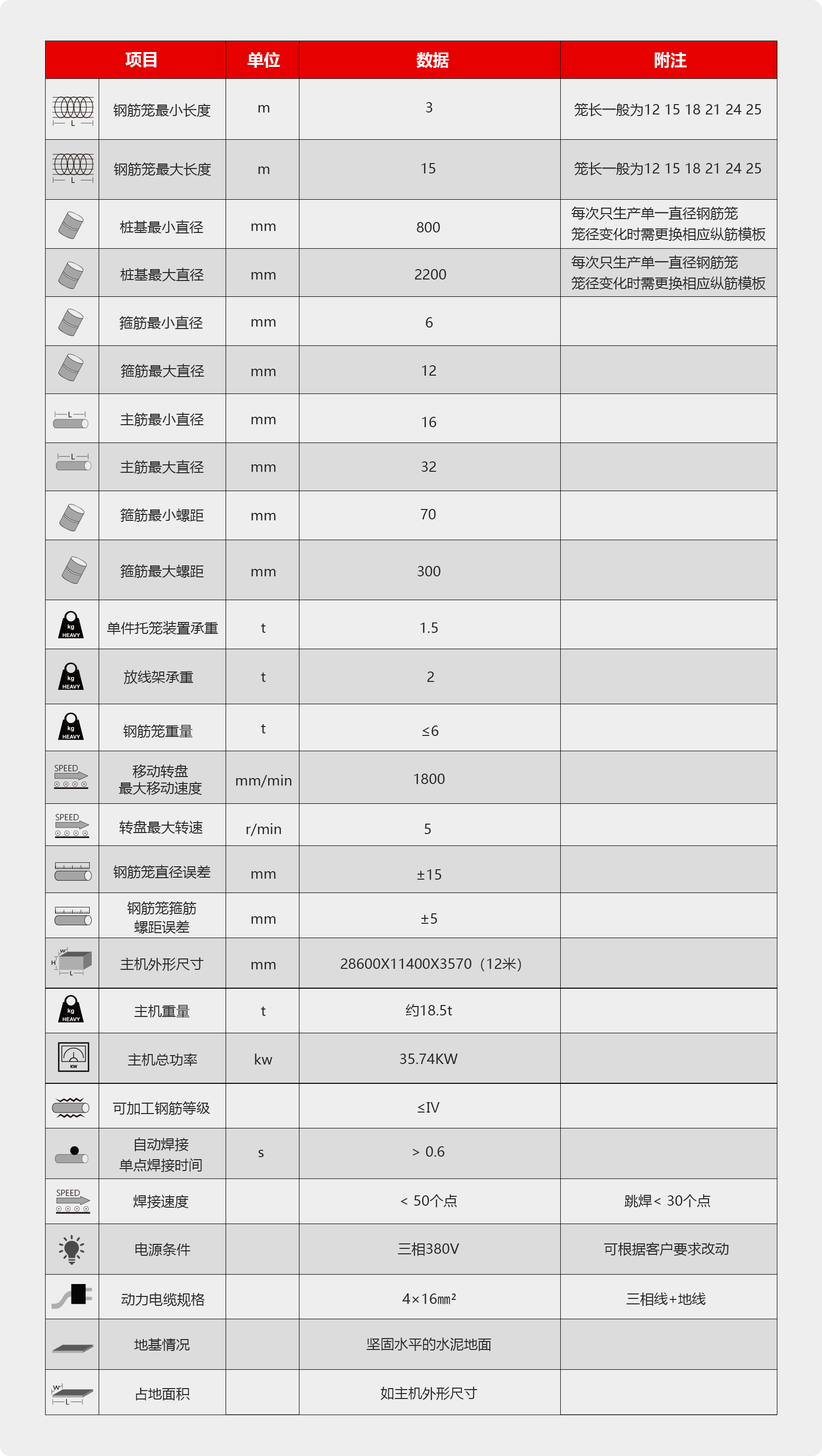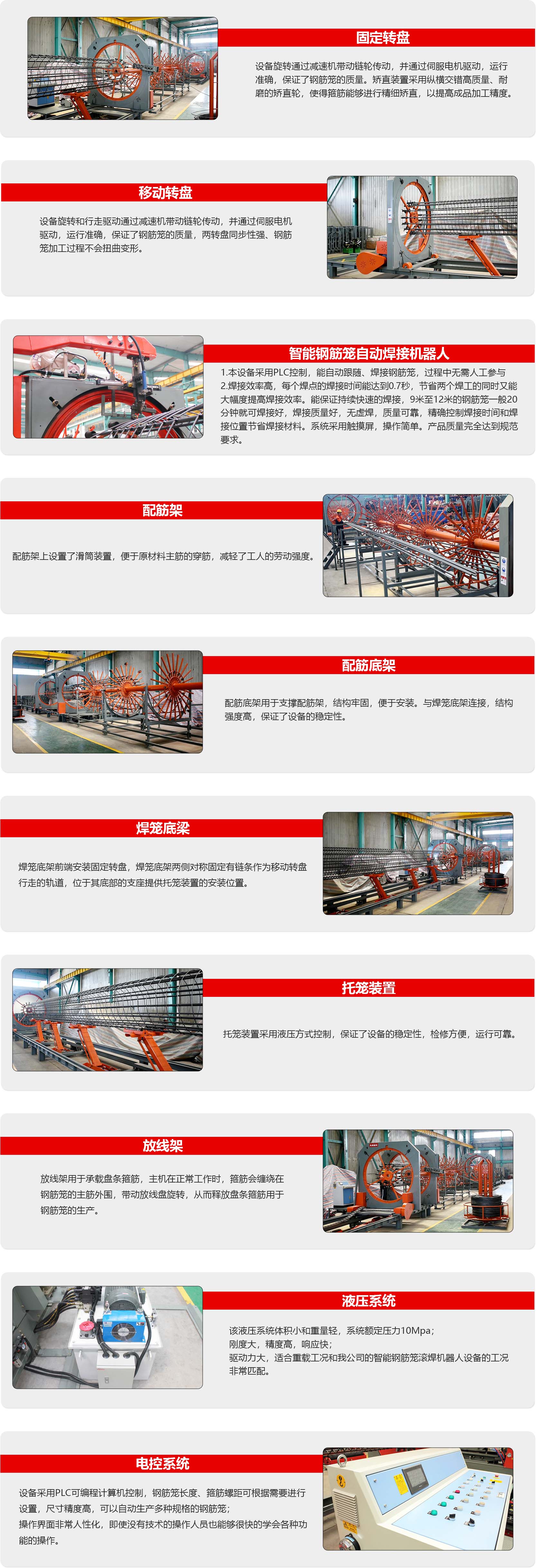 该设备可根据客户的需要配备相应的模圈或者圆盘,将盘条或者直条箍筋螺旋缠绕并焊接在主筋外侧,实现不同规格的钢筋笼的自动化生产,产量大、精度高、变换规格方便、操作故障率低、节能性强、消耗低、质量高。