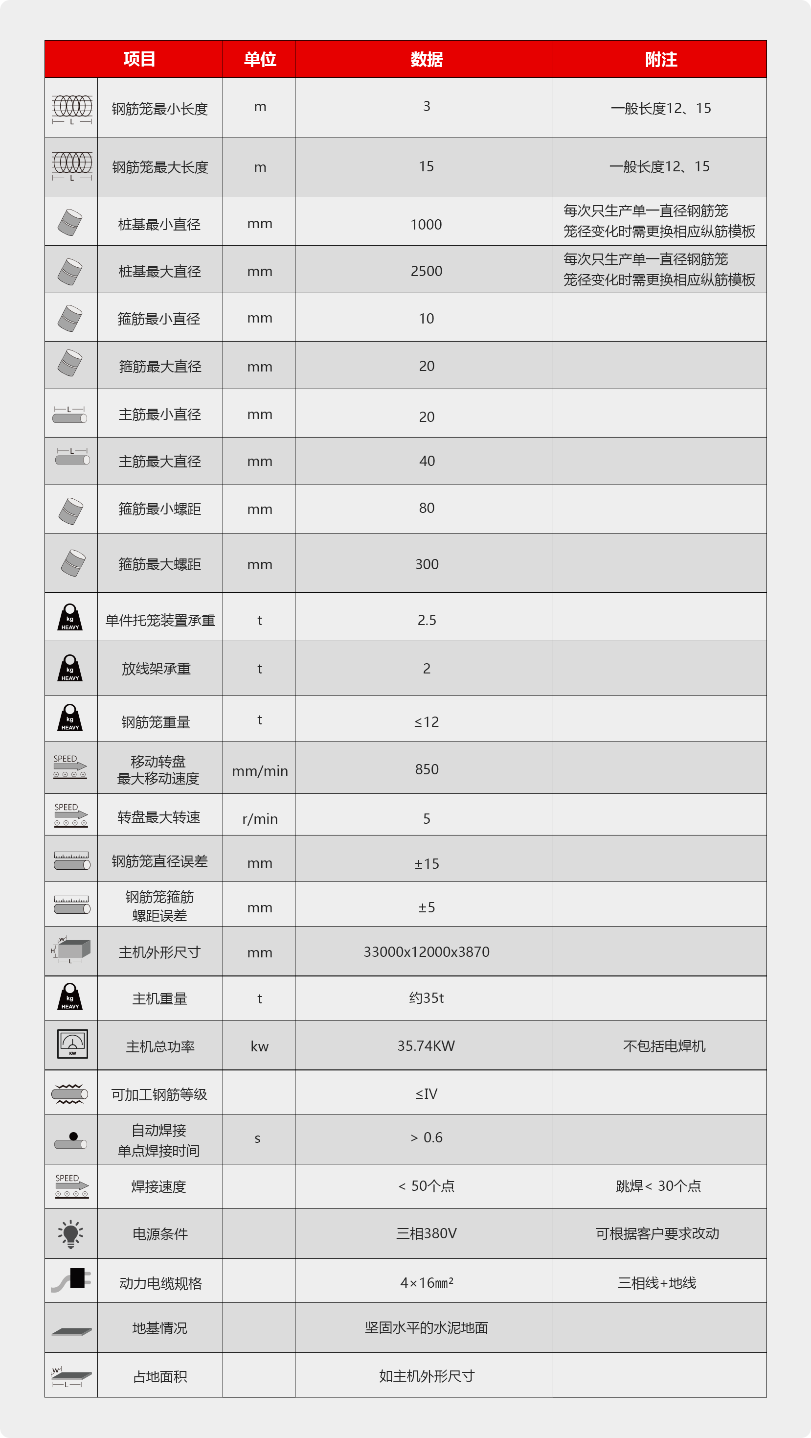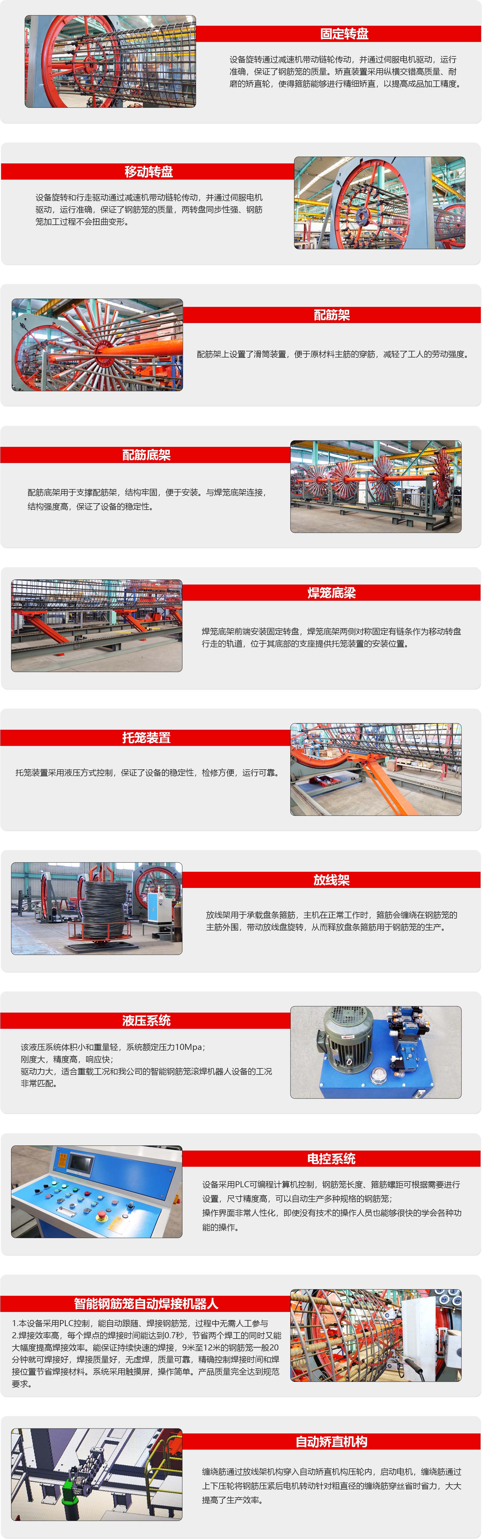 该设备可根据客户的需要配备相应的模圈或者圆盘,将盘条或者直条箍筋螺旋缠绕并焊接在主筋外侧,实现不同规格的钢筋笼的自动化生产,产量大、精度高、变换规格方便、操作故障率低、节能性强、消耗低、质量高,钢筋笼自动焊接机械手,能够完成不同规格钢筋笼的自动焊接,具有独立的操作控制界面,设置简便,位置准确,故障率低,保证了钢筋笼的焊接质量。