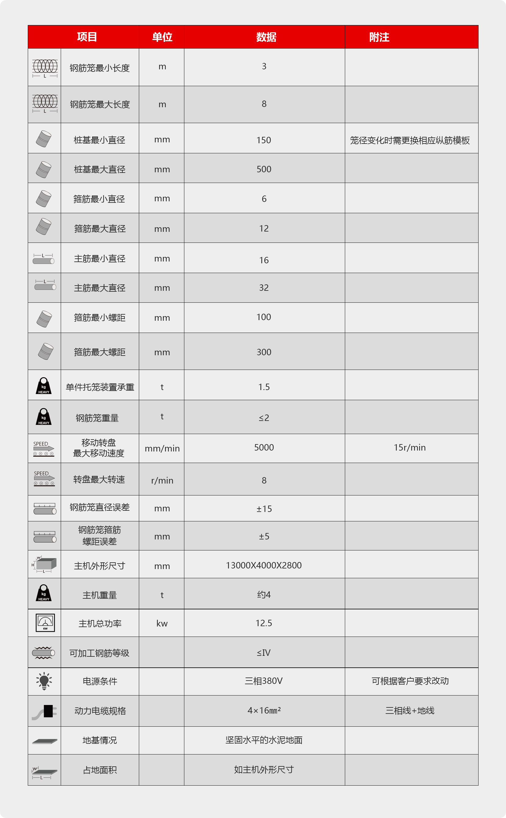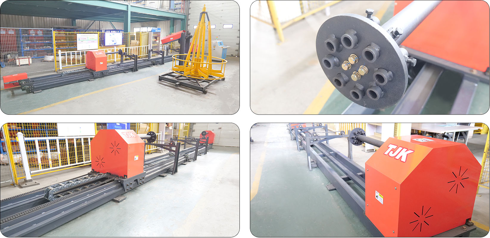 设备旋转通过减速机带动链轮传动,并通过伺服电机驱动,运行准确,保证了钢筋笼的质量。托笼装置链条随动旋转方式,保证了设备的稳定性,检修方便。调直装置采用高质量、耐磨的矫直轮,使得箍筋能够进行精细矫直,以提高成品加工精度达到要求范围。设备采用PLC可编程计算机控制,钢筋笼长度、箍筋螺距可根据需要进行设置,尺寸精度高,可以自动生产多种规格的钢筋笼。关键传动件、执行元件、电、液压元件均采用国际名牌产品,使用寿命长、精度高。系统设有报警系统,对各种位置进行监控,确保设备正常运行。操作界面非常人性化,即使没有技术的操作人员也能够很快的学会各种功能的操作。