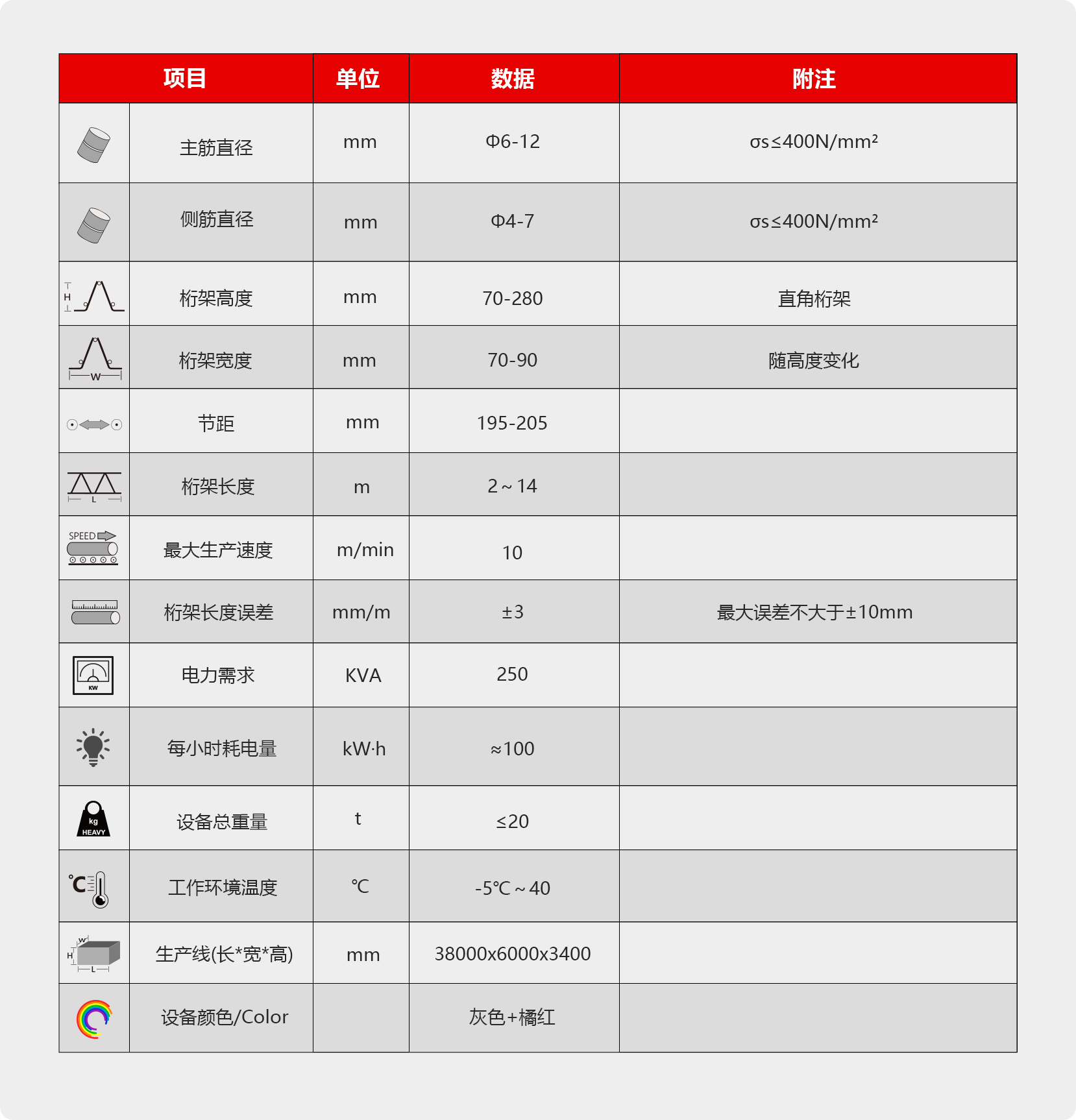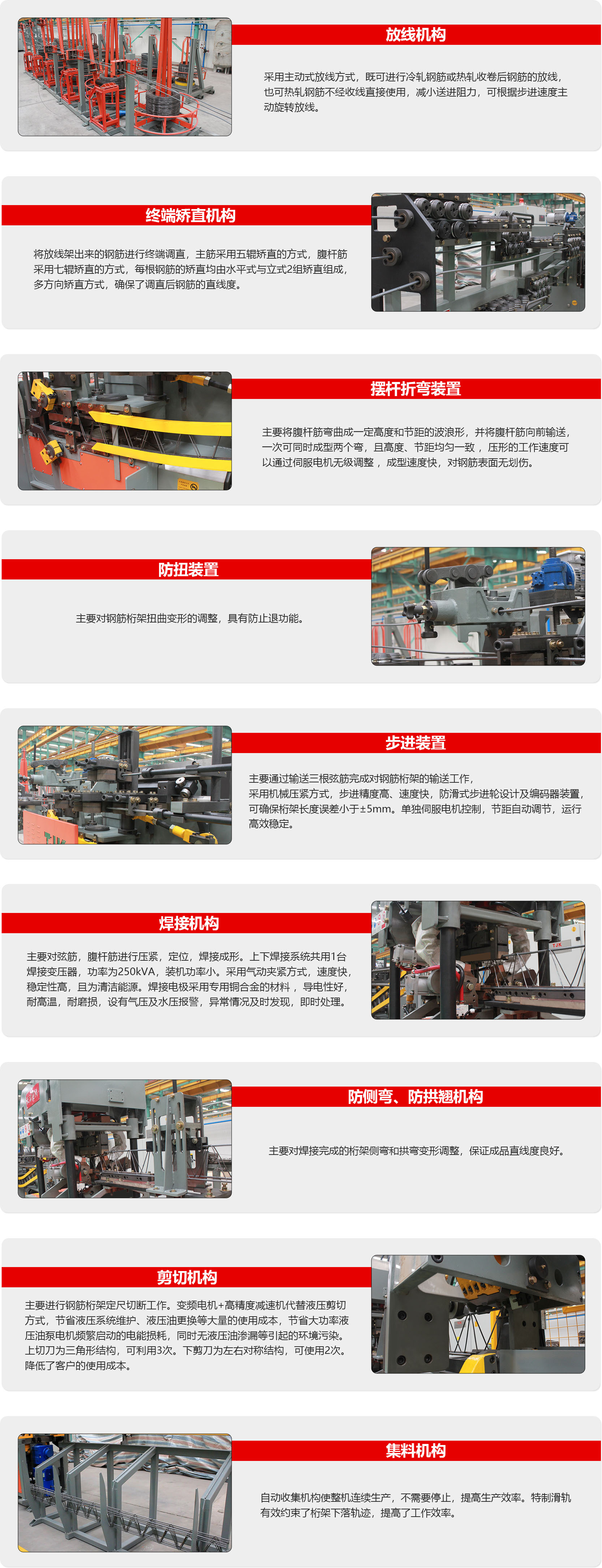 该设备用于将5根规定范围直径的冷/热轧光圆或带肋钢筋,从五个盘条的原料开始, 经过盘条放线、钢筋调直、腹杆筋折弯、自动焊接成型、自动剪切、自动收集为一体的全 自动化生产线,最终的成品为截面呈三角形的钢筋桁架制品,主要用于叠合板用钢筋骨架 和PC预制构件;整条生产线由1人员操作,1人辅助即可。最大生产速度为10m/min。日 产能(生产时间按10H),大约3000m。 该设备的特点是稳定性、装机功率小、使用成本低。