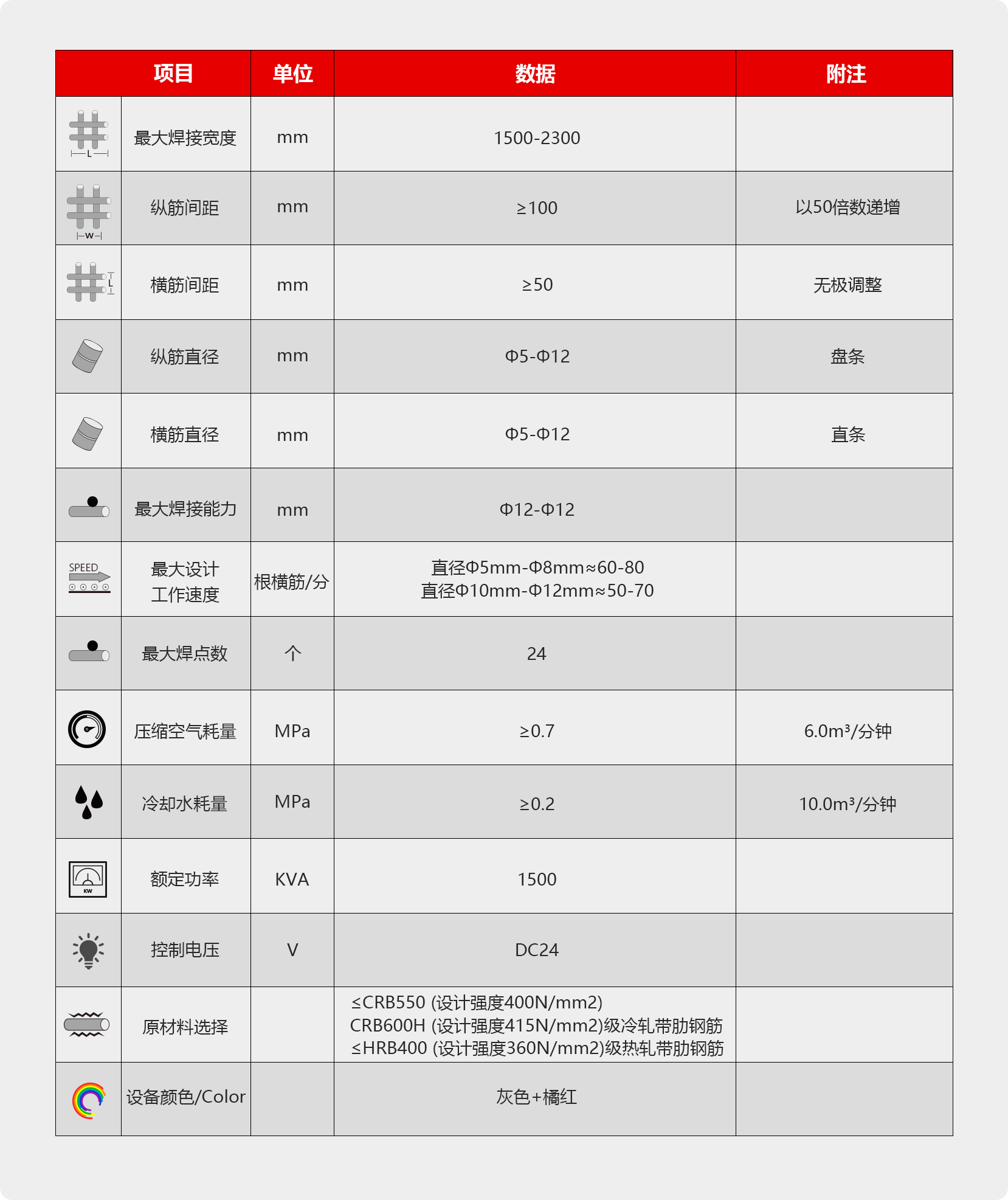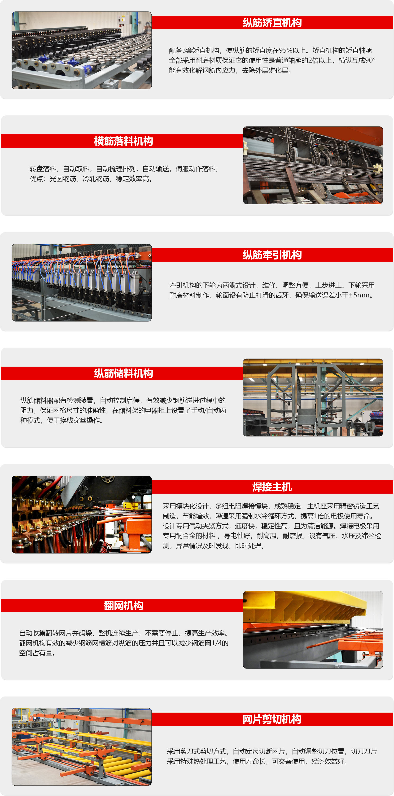 该设备用于公路、铁路、核电、建筑等领域钢筋网片的焊接,设备由放料盘、矫直、 牵引、储料、步进、焊接机、横筋落料、网片剪切、接网、翻网机构组成,可焊接冷拉钢 丝、热轧带肋、冷轧带肋钢筋,采用纵筋盘条横筋直条上料方式,纵筋原材料经过三次应 力释放处理,整机配有整体式基座,安装方便,操作方便、维修简单;设备集原材料自动 送料、自动焊接、自动收集为一体的自动化生产线;设备焊接参数数字化处理,水、电、 气自动检测输出,整条生产线由1人操作,1人辅助即可,最大生产速度为80根/min。