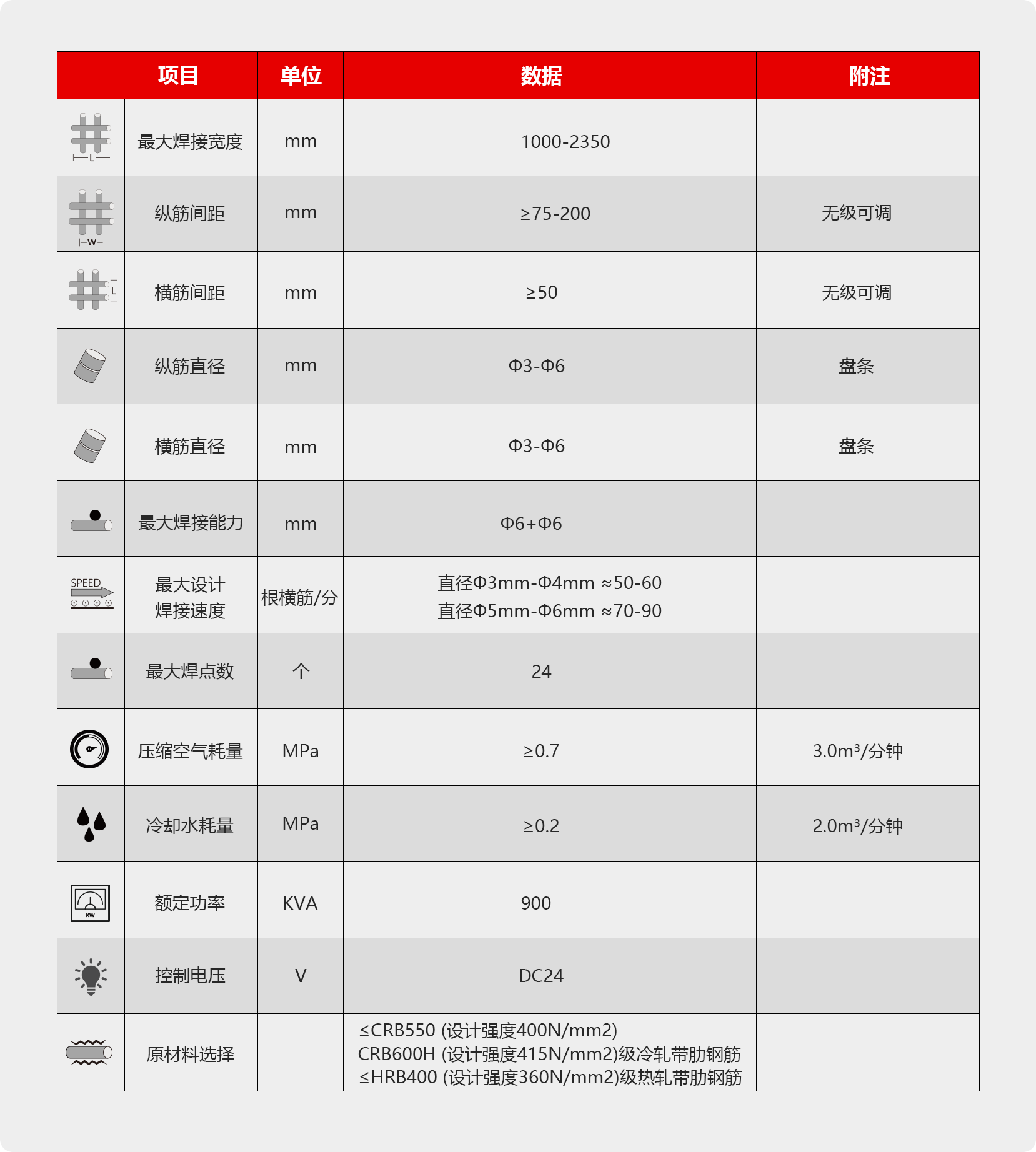 在原有焊网机设备的基础上,经过生产实践同时又结合市场实际需求而进行研制、 生产的焊接钢筋网的成套设备,该设备横筋采用直条上料,纵筋采用盘条上料,焊接速 度快,设备运行稳定。生产线技术涵盖了发明专利(包括发明专利号分别为:2011101 43437.7、201110126533.0等专利),主要使用领域主要包括国内外专业化的围栏, 建筑、矿山等。