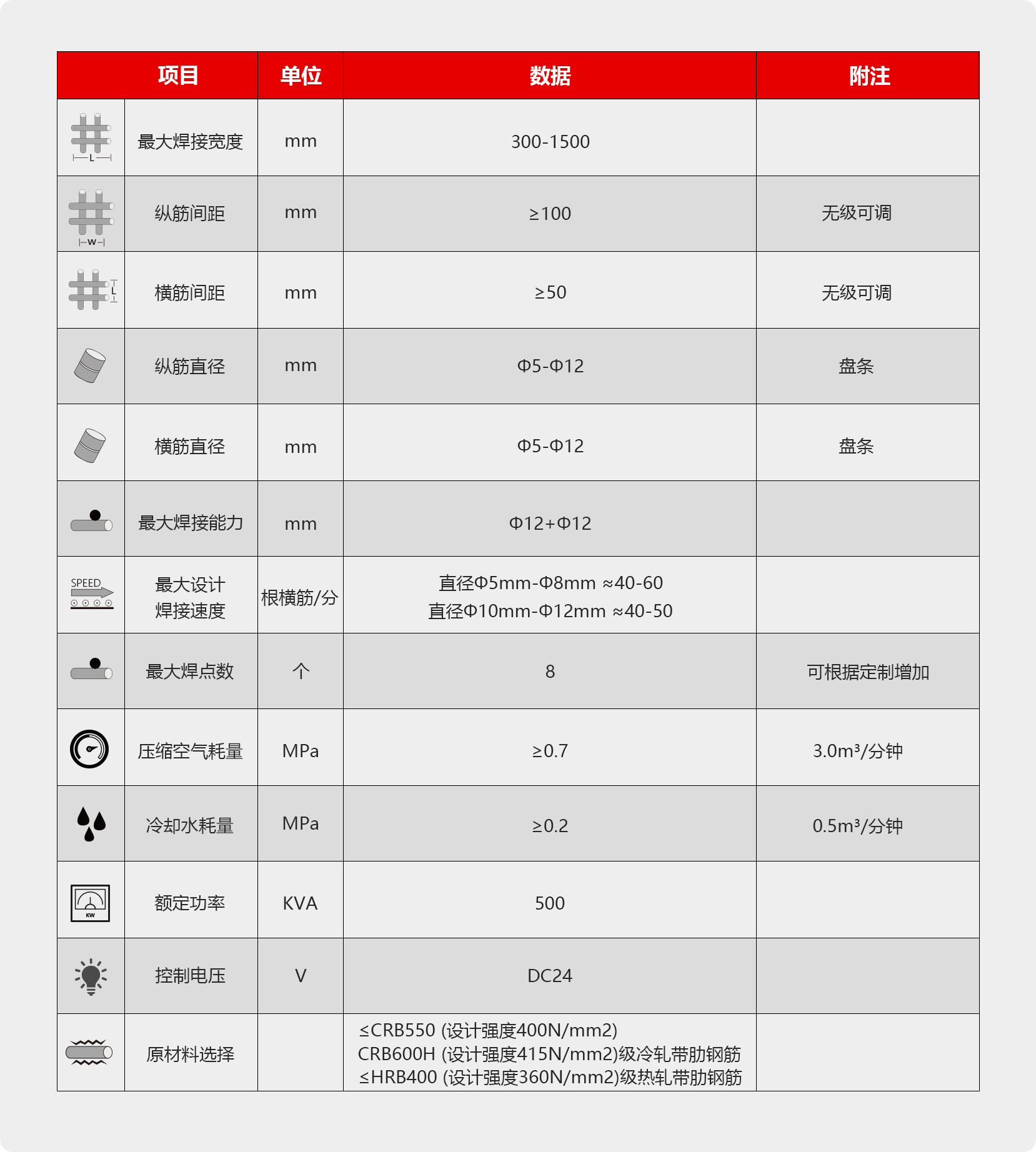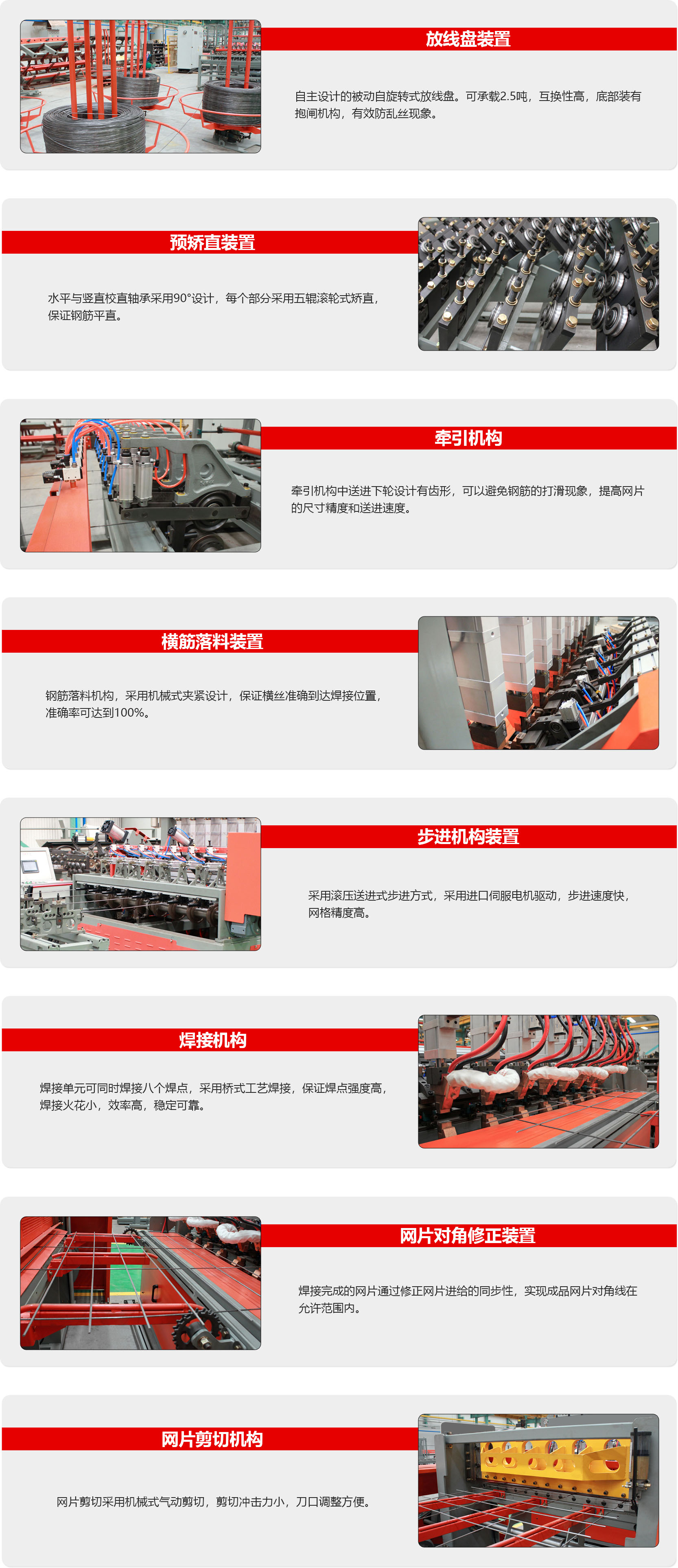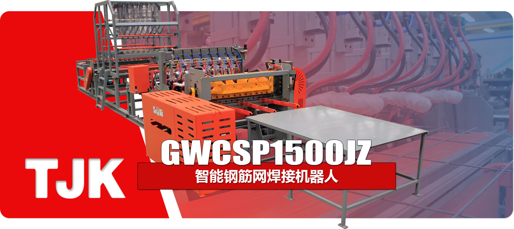 智能钢筋网焊接机器人GWCSP1500JZ,该设备横筋和纵筋为盘条全自动上料, 整机仅需要一人操作。生产线技术涵盖了发明专利(发明专利号201710457340.0), 主要使用领域主要包括国内外专业化的钢筋加工的商品配送中心,高速铁路、公路、 地铁、隧道等。
