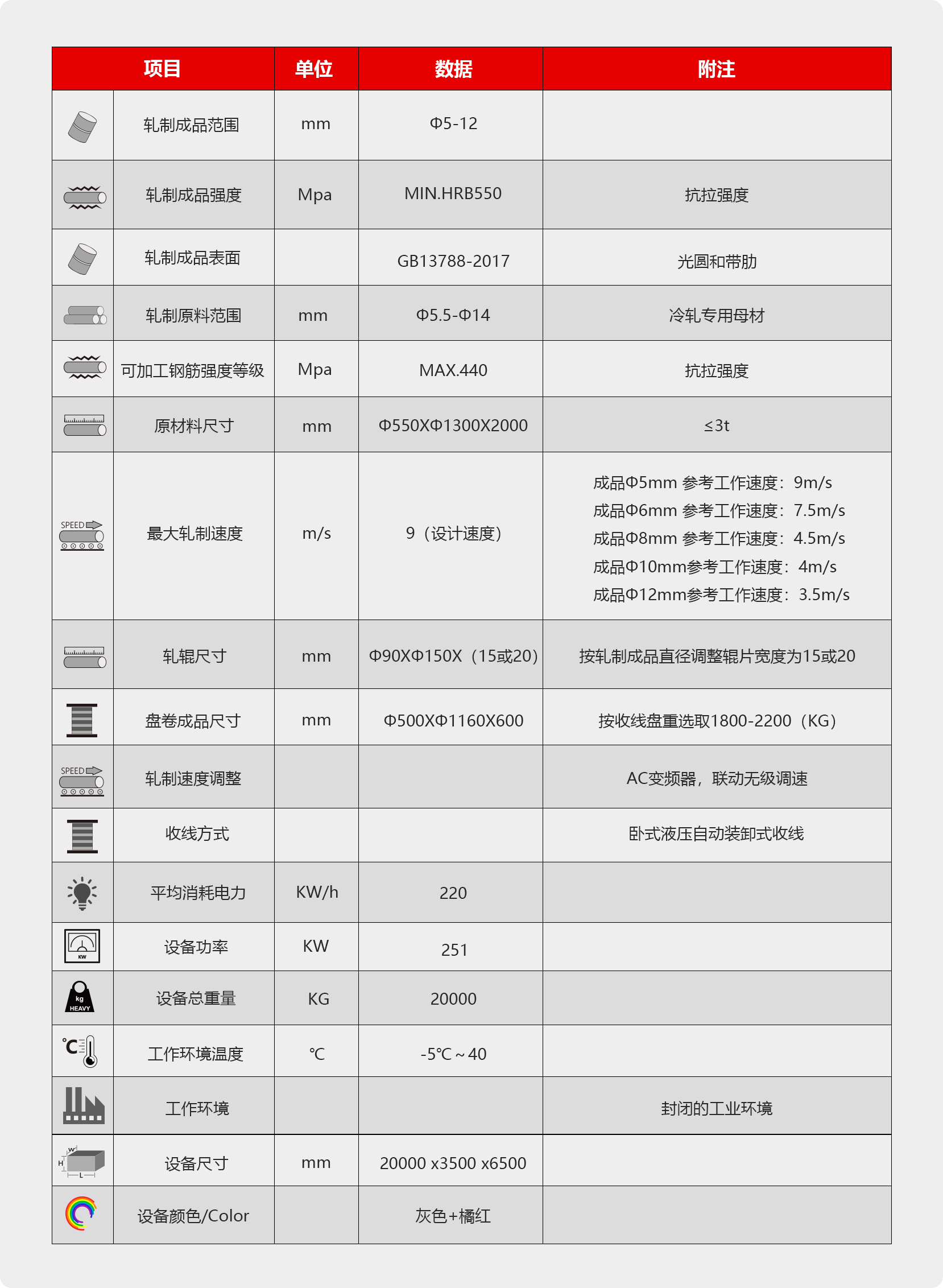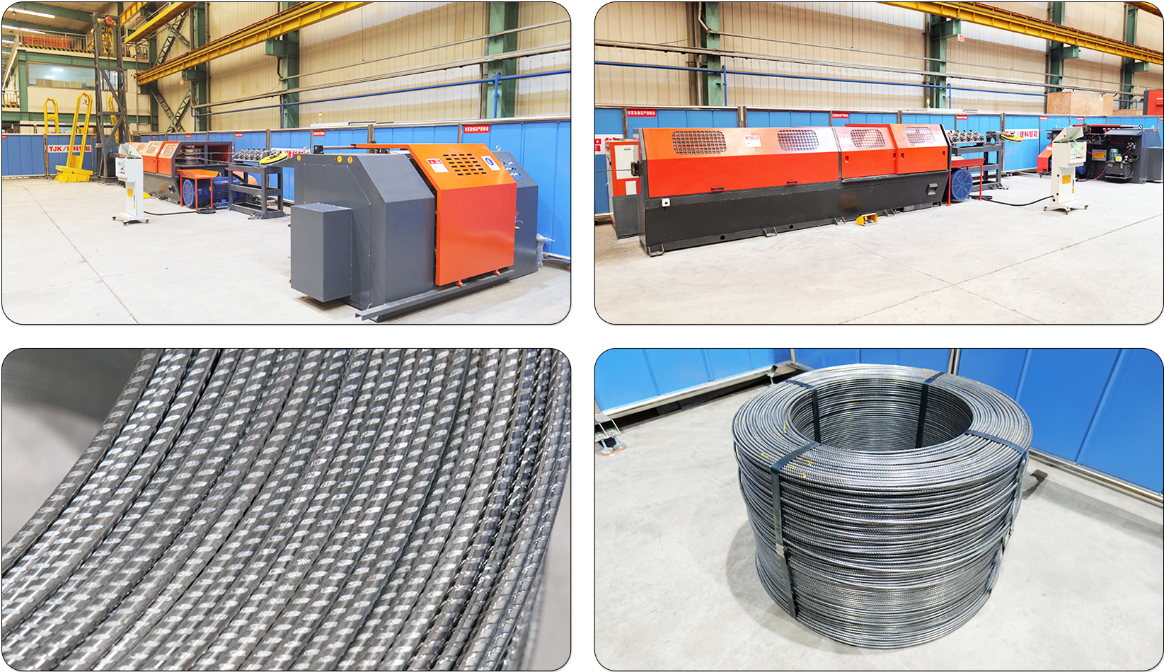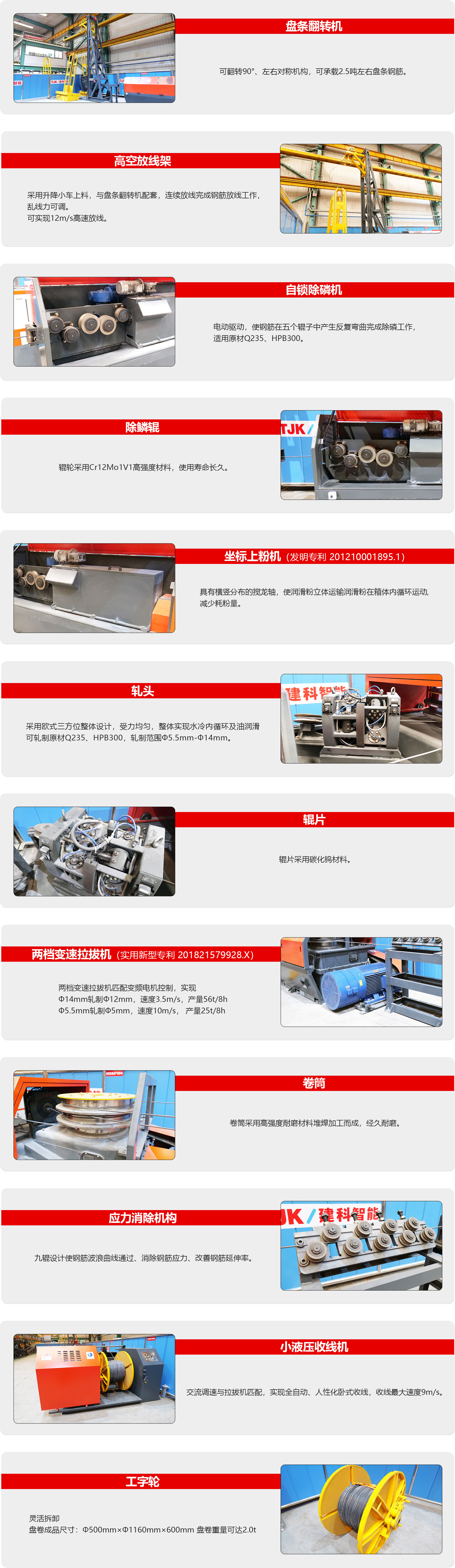产品介绍:智能冷轧带肋钢筋机器人, 通过对原材料热轧盘圆钢筋(Q235、HPB300)进行轧制,生产出符合CRB550的冷轧 带肋钢筋生产线,具有高放线、除鳞、润滑、冷轧、拉拔、应力消除及卧式收卷功能。 产品型号描述:LZ-9集高放线、主机(除磷、上粉、轧头、拉拔)、 卧式收线机于一体,变频电机无极调速,实现最大速度9m/s全自动稳定生产线,轧制钢 筋范围Ф5.5mm-Ф14mm,收取钢筋范围Ф5mm-Ф12mm,设备平均产能高达45t/8h。