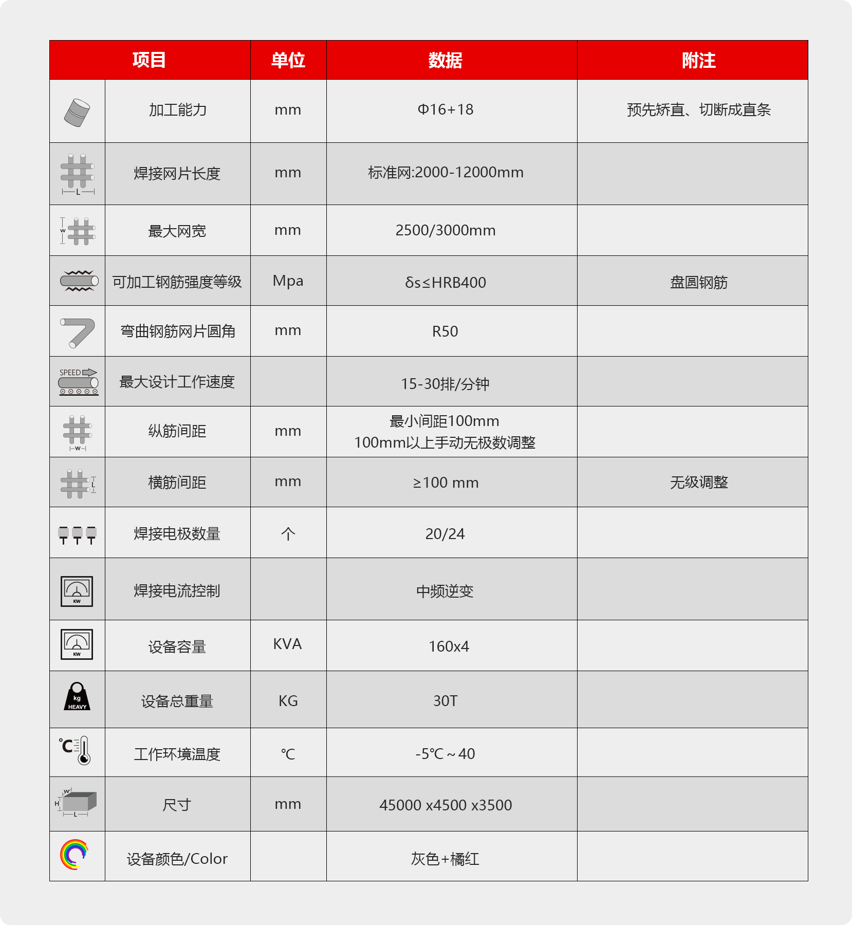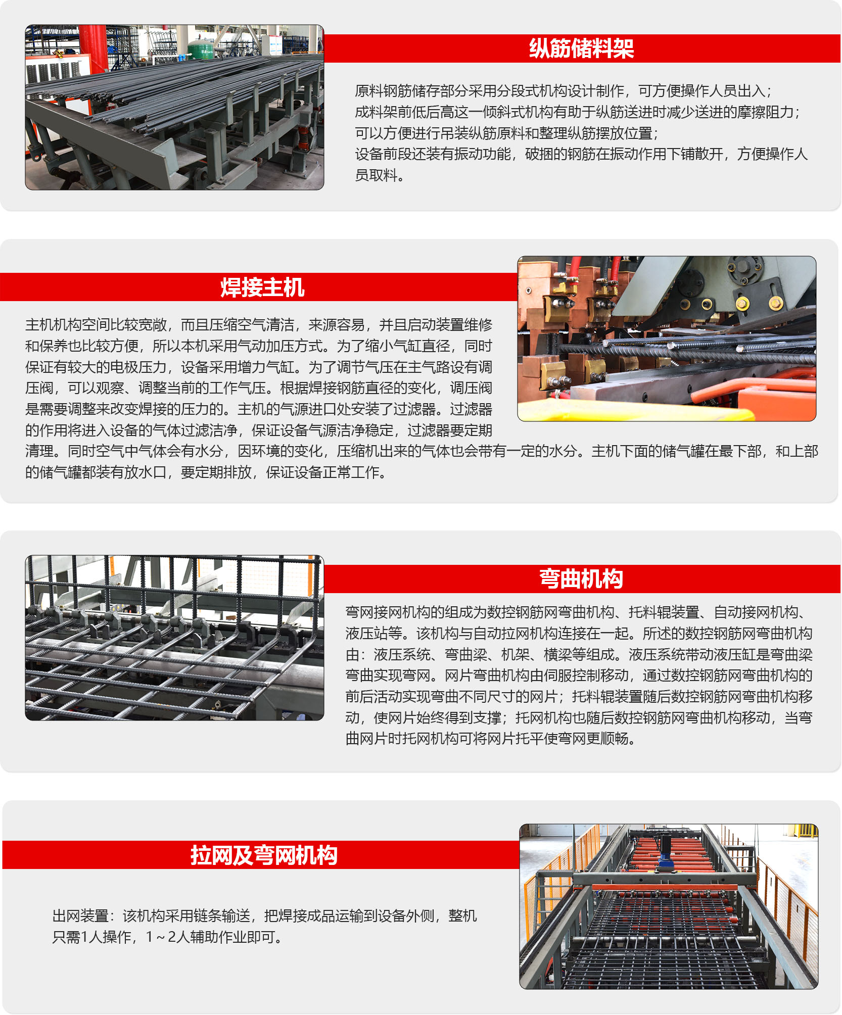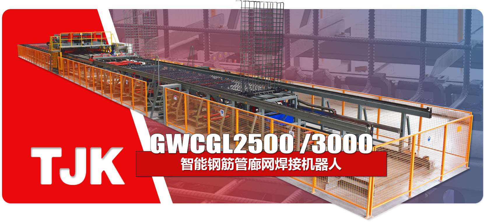 GWCGLGL系列智能钢筋管廊网焊接机器人是建科机械(天津)股份有限公司是结合市场实际需求而进行研制、生产的焊接钢筋网的成套设备,该设备集输送、落料、焊接、 弯曲于一体,可对热轧带肋钢筋、冷轧带肋钢筋、光圆冷拔钢筋进行高质量交叉焊接和弯 曲,产量大、精度高、改型方便、操作故障率低、节能性强、消耗低、质量高。整条生产 线由1人员操作,1人辅助即可。最大焊接能力20+16mm。