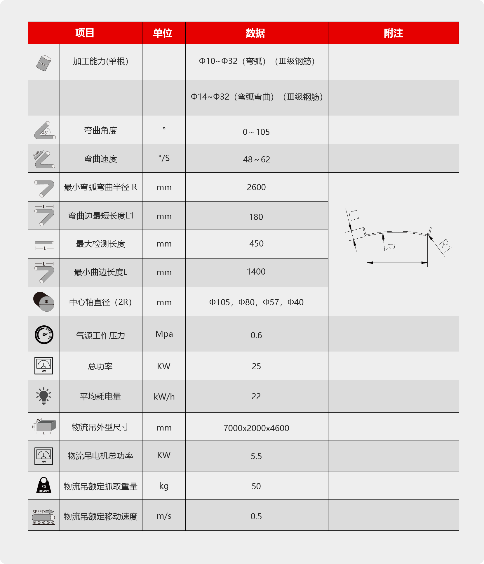WHWQ32智能钢筋弯弧弯曲机器人主要应用在地铁、隧道等场合,用于盾构管片钢筋笼的底筋和面筋的加工过程。该设备区别于传统的加工设备,可以同时弯弧、弯曲直条钢筋,避免中间转序,既可以完成Φ10~Φ32mm的单独弯弧加工,也可以完成Φ14~Φ32mm的弯弧、弯曲一次加工成型。该设备的特点是速度快,精度高,一致性好,实用,可靠,并且具有强大的任务储存能力,更换生产任务方便、快捷。