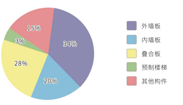 装配式建筑预制构件主要产品包括预制外墙板、预制内墙板、叠合楼板、预制楼梯和其他零星构件等,预制构件平均体积为1.8立方米。各构件的生产比例(体积比)为外墙板34%、内墙板20%、叠合板28%、预制楼梯3%,其他构件15%。