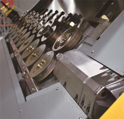GT5-12E-1数控钢筋调直切断机内部采用齿轮+同步带传动方式,牵引速度最快可达130m/min,动力强劲。上料部分配备自动穿丝装置,省时省力。满足双线全主动轮式调直,变化长度规格不需要任何人工机械调整,可加工生产10-12000mm任意长度的直条钢筋。自动的两级接料系统,可以实现多任务连续生产。