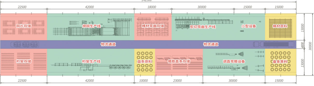 1、车间面积约30x142.5m,包括原材料区、加工区、、绑扎区及成品储存区