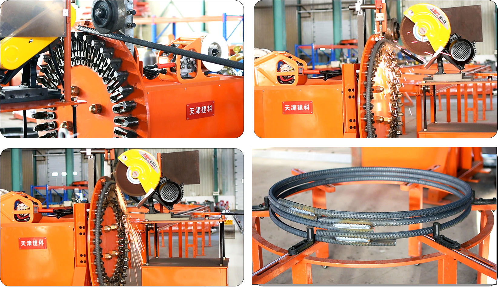 该设备是加工钢筋笼内加强圈的多功能一体机,结构紧凑; 能对直条钢筋进行弯圆、焊接、切断。可调整式弯圆模具,能满足不同客户的桩基需求; 原材钢筋存放料架机构牢固,高度可调整。